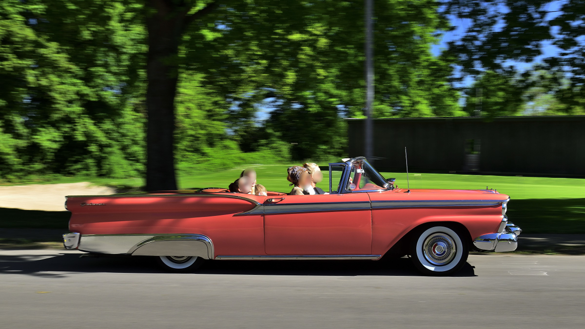 Ford Fairlane 500 Galaxie Sunliner Cabriolet, mitgezogen am 1. Mai 2025 auf der Zufahrt zum Oldtimer Frühlingserwachen beim Sportpark Loherhof Geilenkirchen