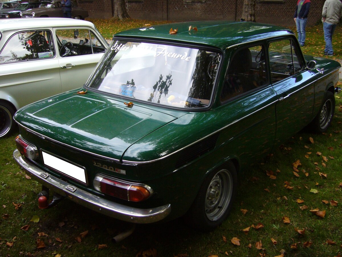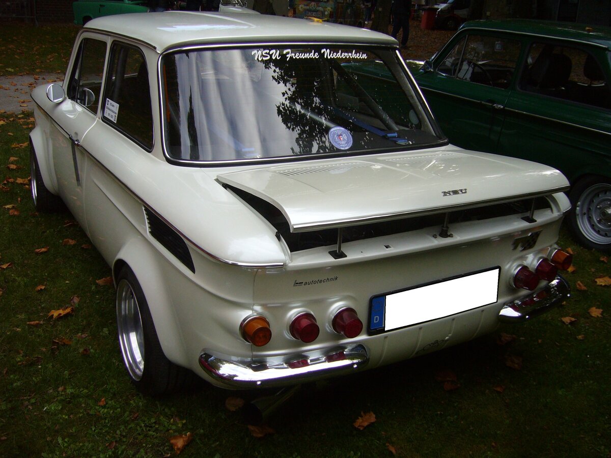 NSU 1200 TT, gebaut in Neckarsulm von 1968 bis 1972. Von diesem sportlichen Gebrauchswagen wurden insgesamt 64.269 Einheiten produziert. Davon 14.942 mit dem 1.0l Motor und 49.327 mit dem 1.2l Motor. Der abgelichtete TT in einem perlmutt Farbton hat serienmäßig einen Vierzylinderreihenmotor mit einem Hubraum von 1177 cm³ und einer Leistung von 65 PS. Wobei ich glaube, das dieser TT technisch verbessert wurde. Oldtimertreffen am Theater an der Niebu(h)rg am 19.10.2025 in Oberhausen/Rheinland.