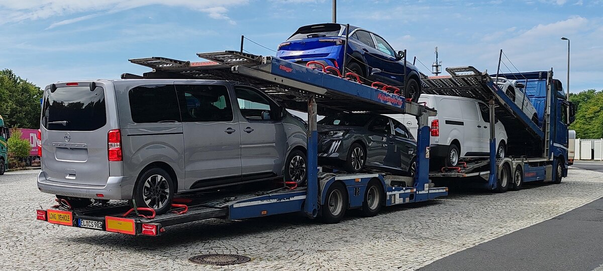 =MB Actros Autotransporter von SANDMANN-Transporte steht auf einem Rastplatz an der A 7 im Juli 2025