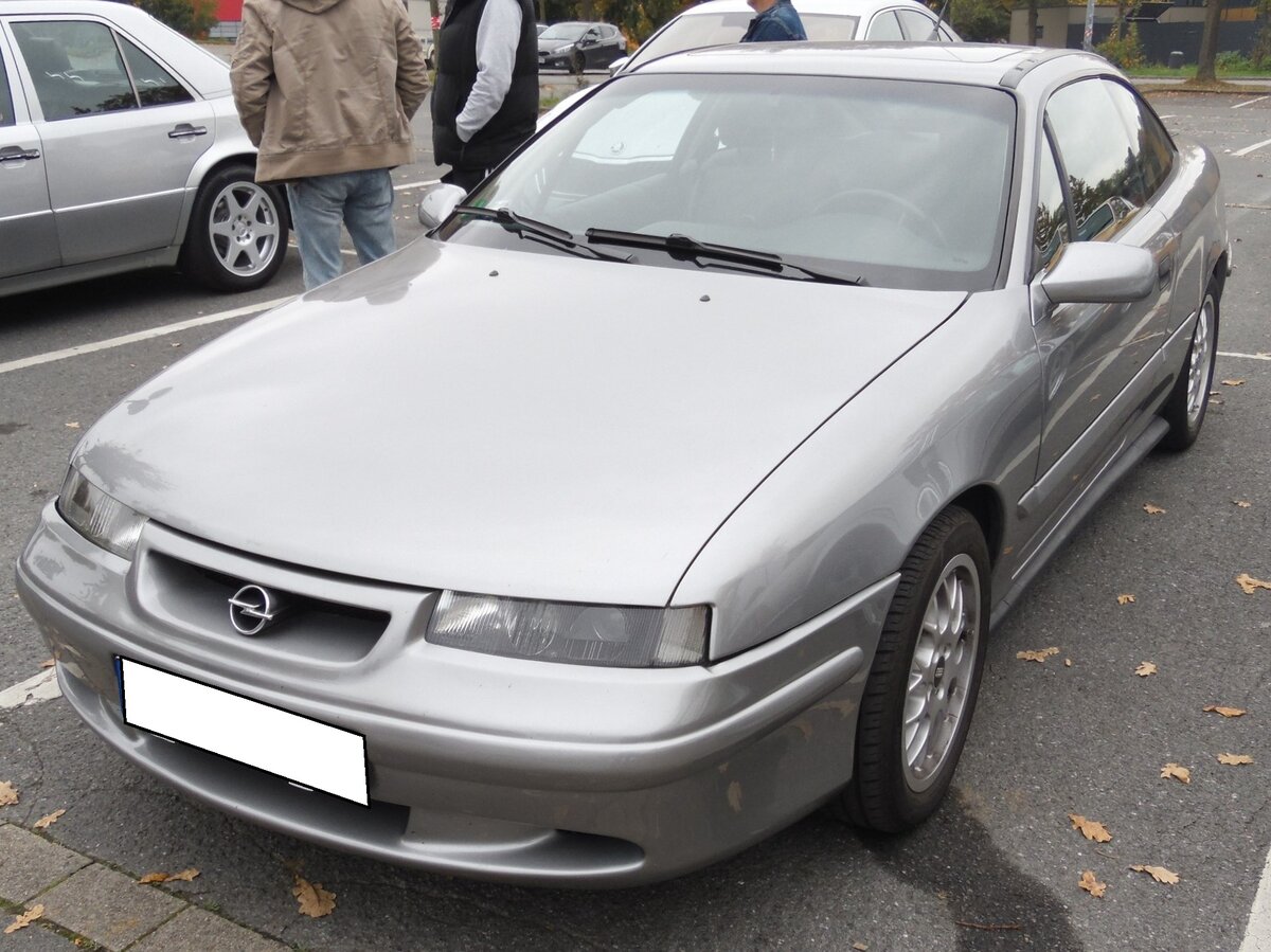 Opel Calibra im Farbton astrosilber. Auf der Basis des im Herbst 1988 eingeführten Opel Vectra A platzierten die Rüsselsheimer ab September 1989 das Sportcoupe Calibra. Der hier gezeigte Calibra müsste ab Sommer 1994 produziert worden sein, da ab dem damaligen leichten Facelift das Opel-Logo im Kühlergrill verbaut war. Standardmotorisierung war ein quer eingebauter Vierzylinderreihenmotor mit einem Hubraum von 1998 cm³ und einer Leistung von 115 PS. Die nächste Steigerungsstufe hatte den selben Motor, allerdings mit Sechszehnventiltechnik. Hier betrug die Leistung 150 PS bzw. 136 PS mit Katalysator. Wurde auf dem genannten Motor ein Turbolader verbaut waren es dann 204 PS. Krönung war der Calibra mit dem V6-Motor mit 2498 cm³ Hubraum und einer Leistung von 170 PS. Oldtimertreffen am Cafe del Sol in Gelsenkirchen am 12.10.2025.
