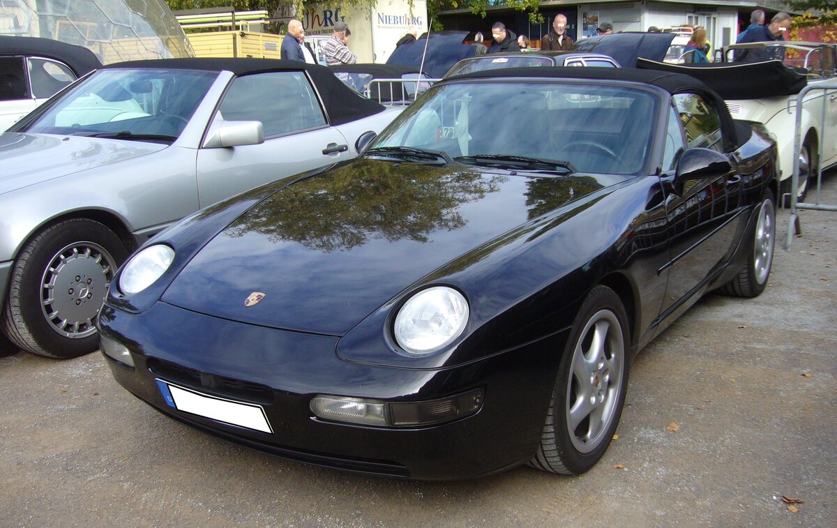 Porsche 968 Cabriolet im Farbton panther schwarz. Mit dem Porsche 968 versuchten die Zuffenhausener ab dem Jahr 1991 den schleppenden Verkauf ihrer Sportwagen, insbesondere in den USA, wieder anzukurbeln. Die Karosserie des Porsche 944 wurde weitgehend genutzt und mit Elementen des Modelles 928 aufgepeppt. Der 968 war als Coupe und Cabriolet lieferbar. Der Vierzylinderreihenmotor hat einen Hubraum von 2990 cm³ und leistet 240 PS. Oldtimertreffen am Theater an der Niebu(h)rg am 19.10.2025 in Oberhausen/Rheinland.