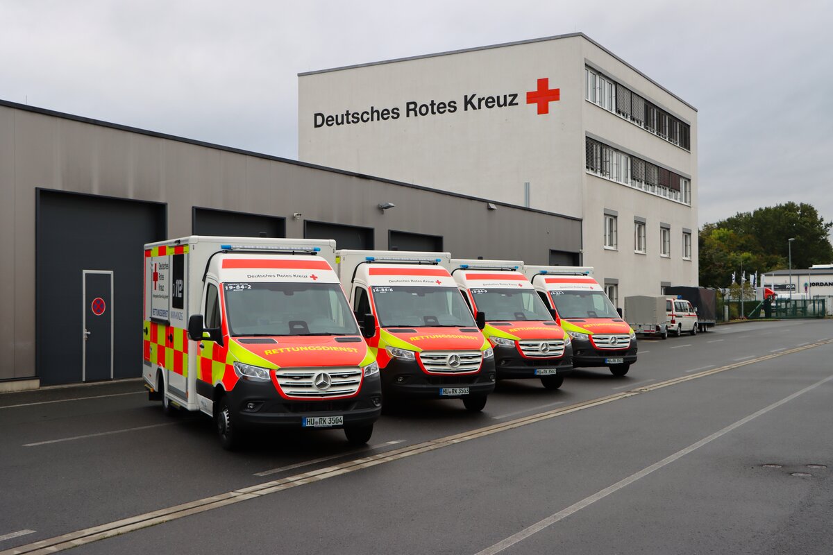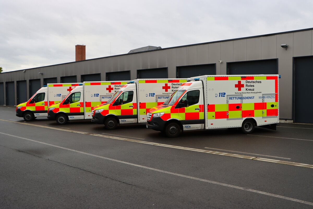 Vier neue auf einen Streich. DRK Rettungsdienst Main Kinzig Kreis Mercedes Benz Sprinter RTW mit Hospimobil Aufbau am 04.10.25 bei einen Fototermin. Es handelt sich um die Wagen (DRK Main Kinzig 19-84-2), (DRK Main Kinzig 14-84-6), (DRK Main Kinzig 14-84-9) und (DRK Main Kinzig 14-84-1)