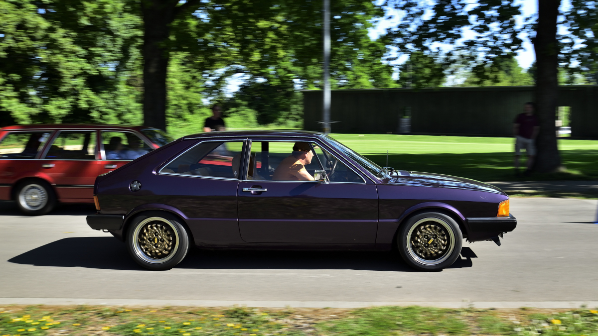 VW Scirocco I Sportcoupé, mitgezogen am 1. Mai 2025 auf der Zufahrt zum Oldtimer Frühlingserwachen beim Sportpark Loherhof Geilenkirchen