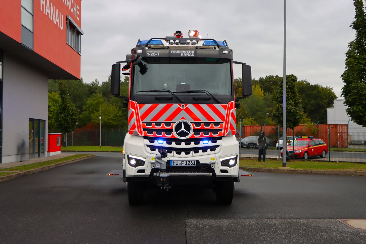 Berufsfeuerwehr Hanau Mercedes Benz Arocs 2642 Lentner GTLF (Florian Hanau 1-26-1) am 04.10.25 bei einen Fototermin. Danke für das tolle Shooting