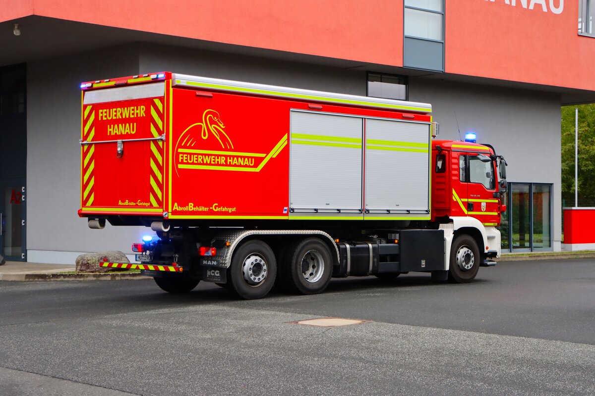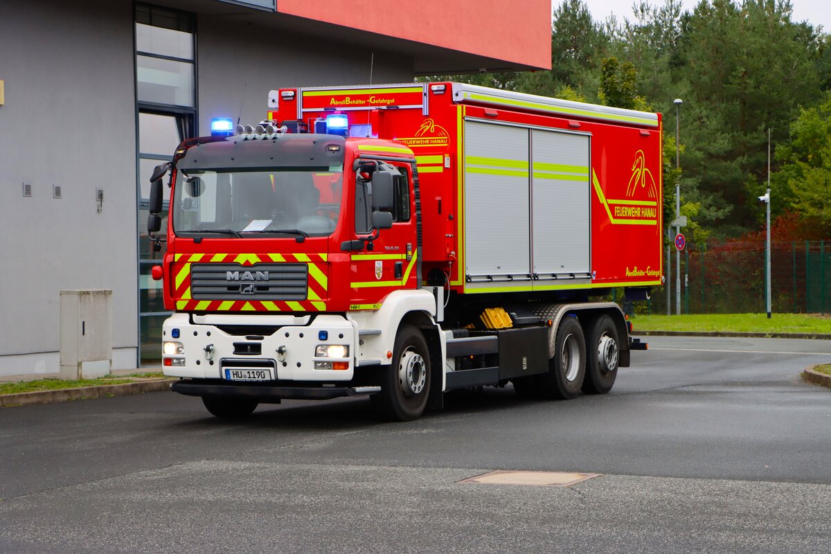 Feuerwehr Hanau Mitte MAN TGA WLF (Florian Hanau 1-66-1) mit AB-Gefahrgut am 04.10.25 bei einen Fototermin. Danke für das tolle Shooting