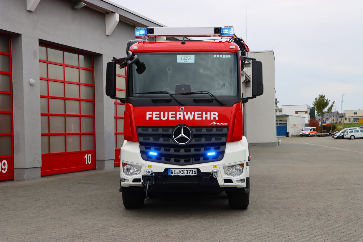 Feuerwehr Langenselbold Mercedes Benz Arocs 3242 WLF Kran Kats (Florian Langenselbold 1-67-1) mit AB-Kran am 19.10.25 bei einen Fototermin. Danke für das tolle Shooting