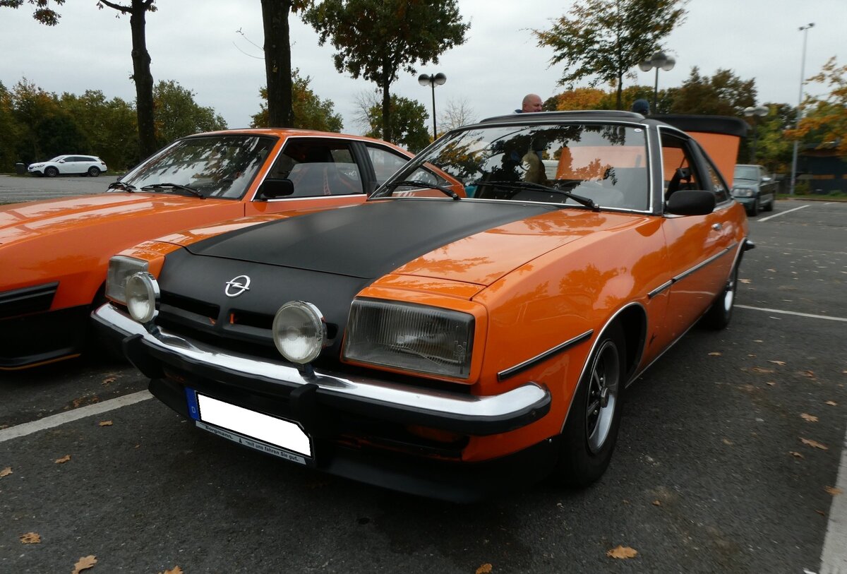 Opel GT/J aus dem Jahr 1973. Produziert wurde das Sportcoupe von 1968 bis 1973. Die Karosserie des GT wurde bei der Firma Brissoneaux & Lotz im französischen Nantes gefertigt und zur Endmontage nach Bochum geliefert. In den ersten drei Produktionsjahren konnte man den GT auch mit dem 1.1l Motor aus dem Kadett ordern. Da sich aber nur 3.573 Kunden für den schwachbrüstigen 1100´er entschieden, wurde er im Jahr 1970 aus dem Programm genommen. Ab diesem Zeitpunkt gab es nur noch den 90 PS starken Vierzylinderreihenmotor mit einem Hubraum von 1897 cm³. Ab März 1971 ergänzte das Modell GT/J die Produktpalette. Bei diesem Modell waren, alle sonst verchromten Bauteile, mattschwarz eingefärbt. Diese Maßnahme sollte insbesondere, das junge, sportlich ausgerichtete Kundenklientel ansprechen. Oldtimertreffen am Theater an der Niebu(h)rg am 19.10.2025 in Oberhausen/Rheinland.
