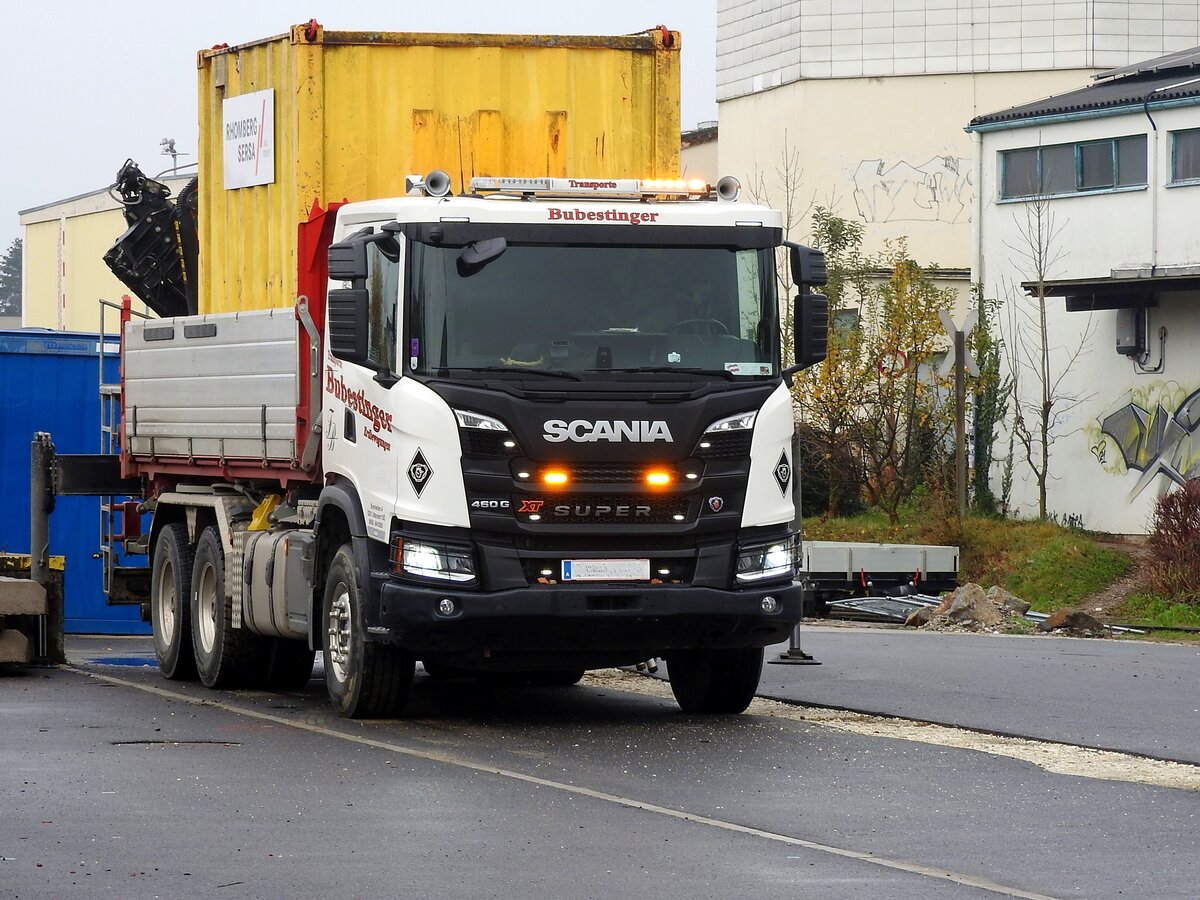 SCANIA 460G hat gerade einen Baustellencontainer geladen; 251110