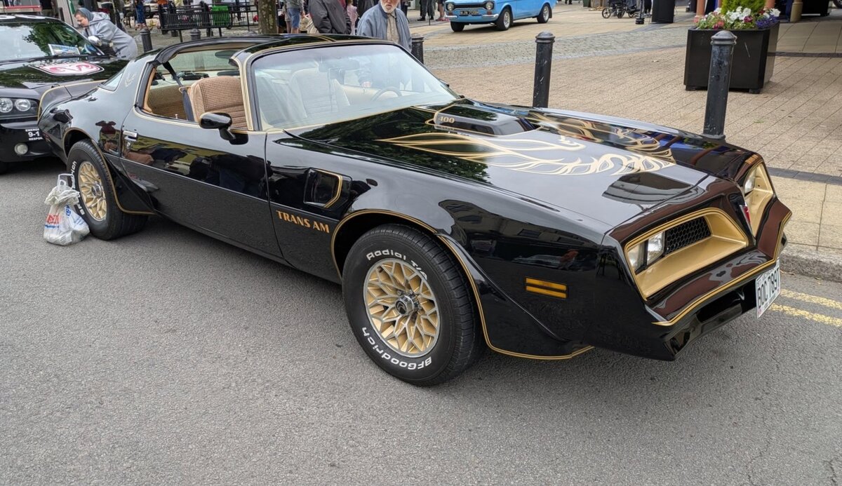 Auch eine US-amerikanische Auto-Ikone: Einer von 2699 im Jahr 1977 ausgelieferten Pontiac Firebird Trans Am in der Ausstattungsvariante Y82. Das bedeutet: Die Lackierung im Farbton starlight black mit den golden abgesetzten Applikationen und dem überdimensionalen "Firebird" auf der Motorhaube. Zusätzlich war das Modell mit den werksmäßigen "Hurst-Targa-Tops" ausgerüstet. Wie man der Hutze auf der Motorhaube entnehmen kann, ist unter der Haube ein V8-Motor mit einem Hubraum von 400 cui (6555 cm³) mit einer Leistung von 203 PS verbaut. Classic car meeting in Brynmawr/South Wales am 27.07.2025.