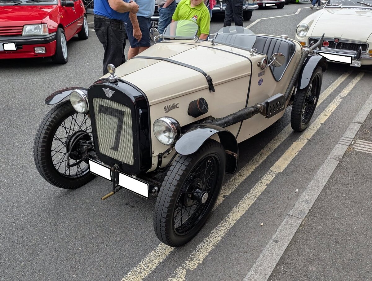 Austin 7 Ulster. Die Austin Motor Company brachte im Jahr 1922 das kleine, viersitzige, Modell "7" auf den Markt. Bis 1936 wurde es mit etlichen Karosserievarianten angeboten. Der gezeigte Austin 7 in der sportlichen Karosserieversion "Ulster" wurde ab 1926 angeboten. In den Jahren 1926-39 wurde der Austin Seven Ulster oft erfolgreich für Berg- und Rundstreckenrennen eingesetzt. Das Modell wurde auch bei großen internationalen Veranstaltungen, wie z.B. dem Eifelrennen auf dem Nürburgring im Jahr 1932 eingesetzt. Das gezeigte Auto mit dem Kosenamen "Jane" stammt aus dem letzten Modelljahr 1932. Der Vierzylinderreihenmotor aus Leichtmetall hat einen Hubraum von 747 cm³ und leistet nach einer technischen Optimierung rund 40 PS. Da das Auto nur rund 485 Kilogramm wiegt, waren Geschwindigkeiten bis zu 120 km/h möglich. Classic car meeting in Brynmawr/South Wales am 27.07.2025.