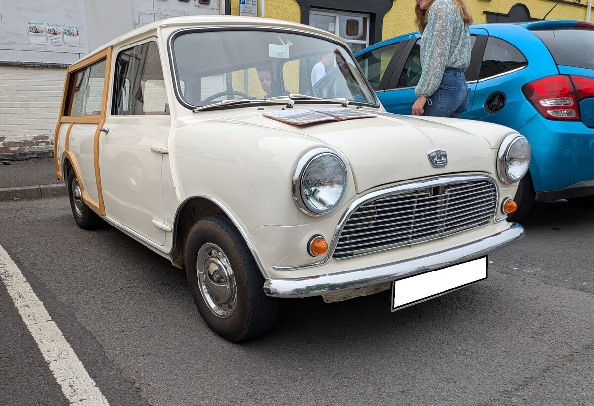 Austin Mini MK1 Countryman aus dem Jahr 1967. Dem im Jahr 1959 vorgestellten Mini wurde im Mai 1960 eine Lieferwagen-Version mit einem, um 7,5 cm verlängerten Radstand, zur Seite gestellt. Diese Version war so erfolgreich, dass einige Monate später ein verglaster, viersitziger Kombi mit den Namen Countryman bei Austin und Traveller bei Morris auf den Markt kam. Nach ca. 207.000 Fahrzeugen wurde er 1969 durch den neuen Mini Clubman Estate ersetzt. Der gezeigte "Countryman MK1" hat einen quer eingebauten Vierzylinderreihenmotor mit einem Hubraum von 848 cm³ und leistet 34 PS. Classic car meeting in Brynmawr/South Wales am 27.07.2025.