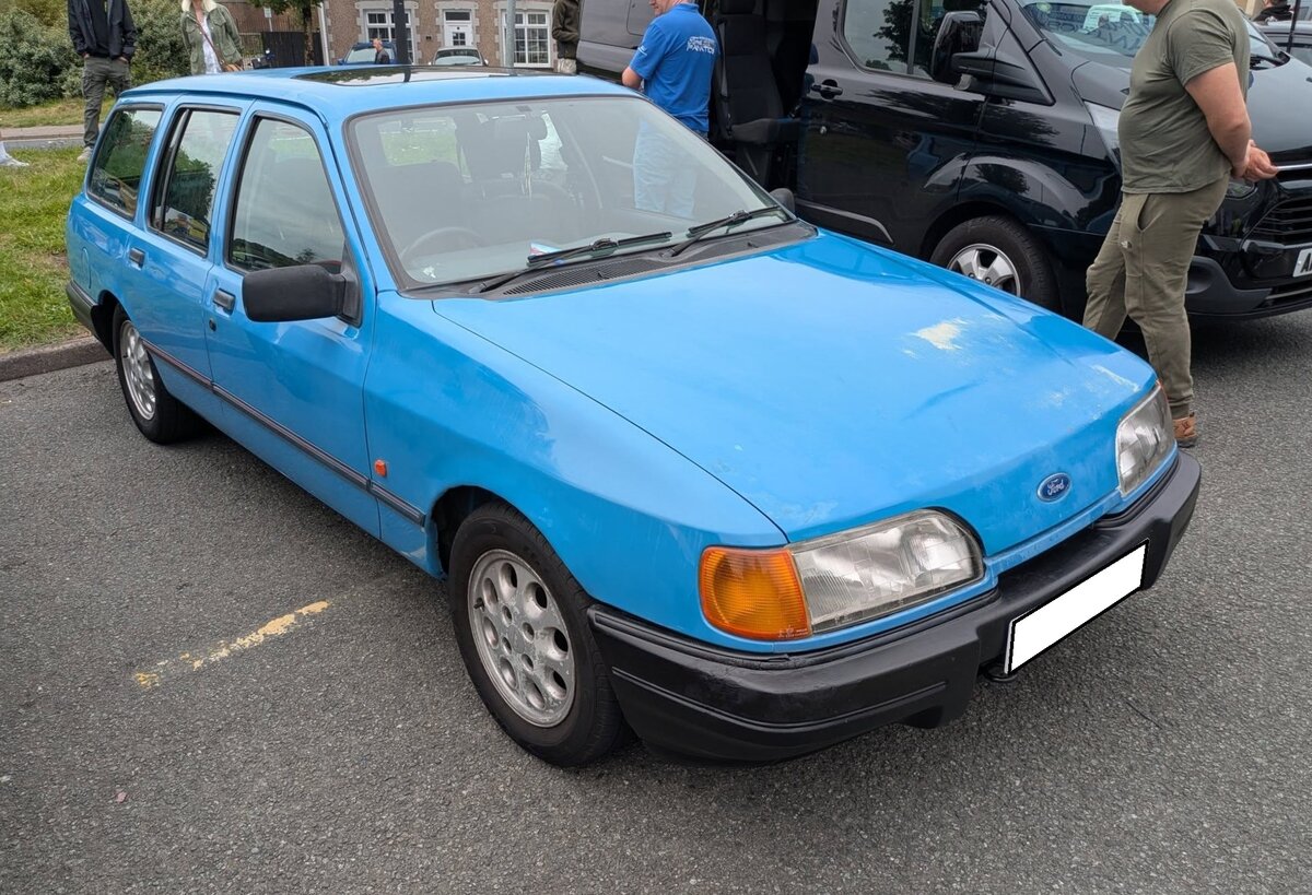 Ein fünftüriger Ford Sierra Turnier der zweiten Baureihe. Der Ford Sierra kam 1982 auf den Markt und wurde 1987 zum ersten mal umfangreich überarbeitet. Die Modelle der zweiten Baureihe sind an den nun breiteren und flacheren Frontscheinwerfern zu erkennen, Das hier gezeigte Kombimodell "Turnier" ist mit dem 1.8 Liter Motor ausgerüstet. Dieser Vierzylinderreihenmotor hat einen Hubraum von 1796 cm³ und leistet je nach Baujahr und Auslieferungsland zwischen 80 PS und 90 PS. Classic car meeting in Brynmawr/South Wales am 27.07.2025.