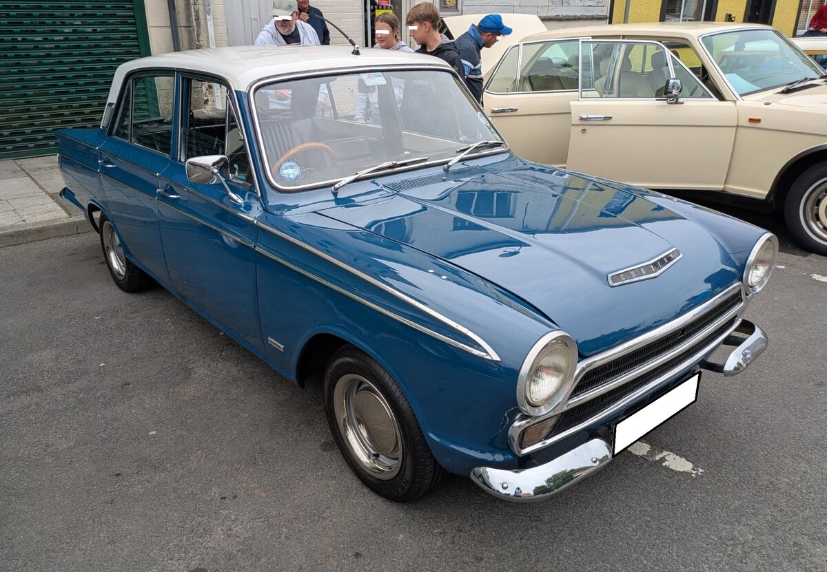 Ford Cortina MK1 1500 in der Karosserieversion viertürige Limousine aus dem Jahr 1965. Gebaut wurde der Cortina MK1 1962 bis 1966 bei Ford/GB. Der Cortina war als zwei- und viertürige Limousine und als fünftüriges Kombimodell names "Estate" lieferbar. Das Modell war das britische Gegenstück zum deutschen Ford Taunus P4. Außerhalb Englands wurde der Wagen hauptsächlich in die BeNeLux-Staaten, in die Schweiz und nach Österreich verkauft. Das Modell war wahlweise mit zwei Vierzylinderreihenmotor lieferbar: 1198 cm³ mit 49 PS oder 1498 cm³ mit 60 PS, wie der abgelichtete Cortina MK1. Classic car meeting in Brynmawr/South Wales am 27.07.2025.