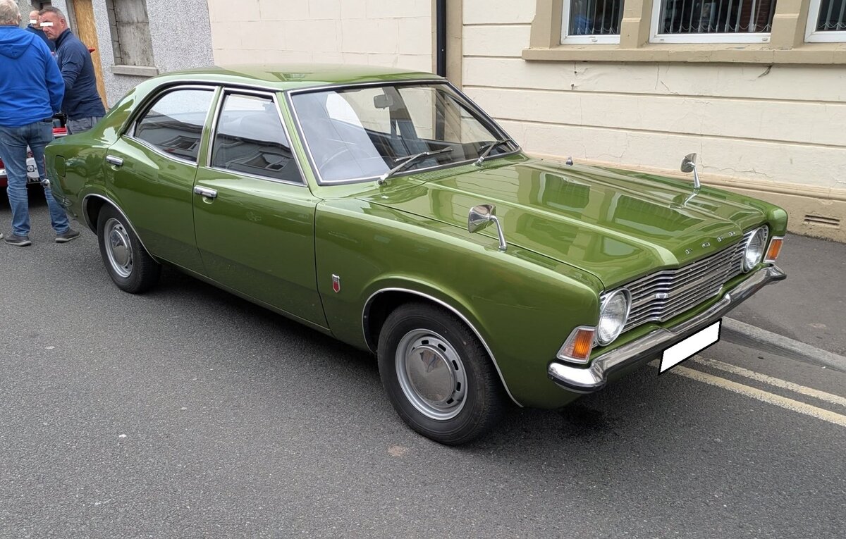 Ford Cortina MK3 in der Karosserieversion viertürige Limousine. Im Jahr 1970 stellte Ford/GB den Cortina MK3 vor. Eine gewisse Ähnlichkeit mit dem Ford Taunus TC aus deutscher Produktion ist nicht von der Hand zu weisen. Am prägnantesten ist hier die so genannte "Knudsen-Nase". Der britische Cortina, der das gleiche Chassis wie der Taunus TC hatte, wies aber einen "Hüftschwung" im so genannten "Coke-bottle-Design" vor der C-Säule aus. Der abgelichtete Cortina im Farbton fern green wurde 1972 erstmalig zugelassen. Ausgestattet ist dieser Cortina mit einem Vierzylinderreihenmotor mit einem Hubraum von 1599 cm³ und einer Leistung von 69 PS. Classic car meeting in Brynmawr/South Wales am 27.07.2025.