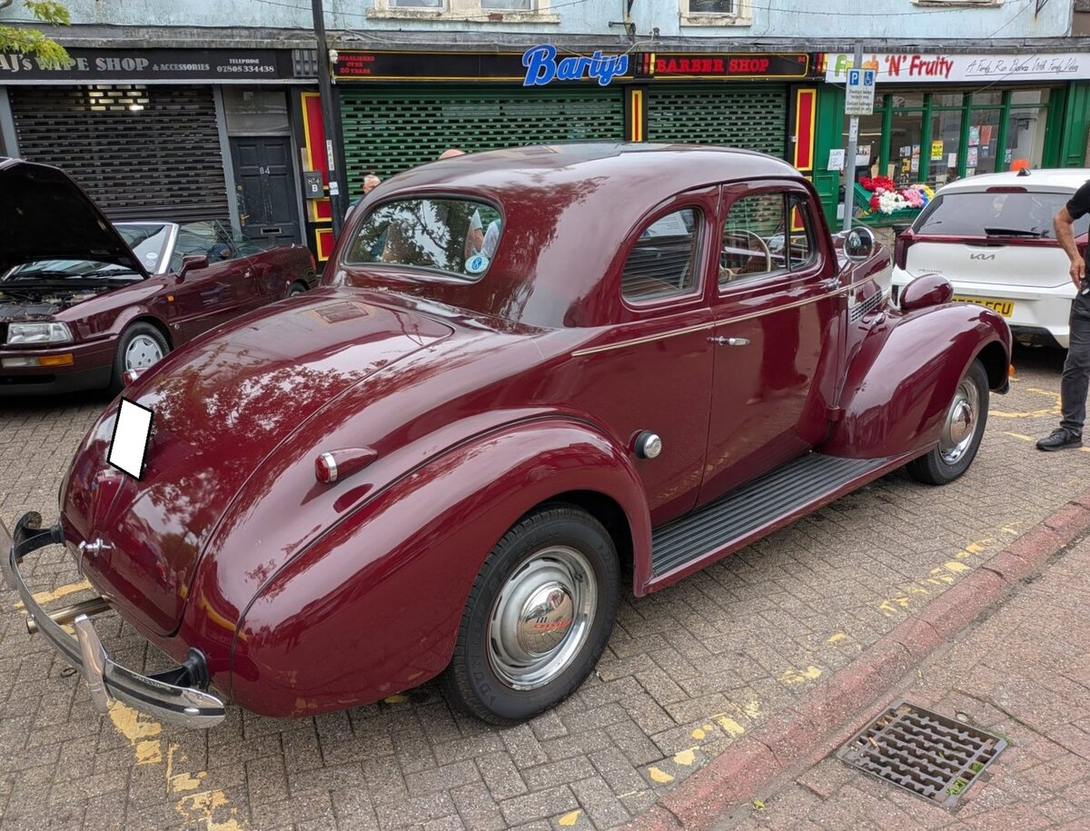 Chevrolet Series 85 JA-Six Master DeLuxe Business Coupe im Farbton cloisonne maroon aus dem Jahr 1939. Im Modelljahr 1939 gab es das normale Business Coupe und das etwas besser ausgestattete DeLuxe Business Coupe (Foto). Der Preis für ein solches Auto betrug 1939 mindestens US$ 684,00. Insgesamt setzte Chevrolet von diesem Modell 1939 33.809 Fahrzeuge ab. Vom Standardmodell noch einmal 41.770 Stück. Angetrieben wird das Coupe von einem Sechszylinderreihenmotor mit einem Hubraum von 3540 cm³ und einer Leistung von 85 PS. Classic car meeting in Brynmawr/South Wales am 27.07.2025.