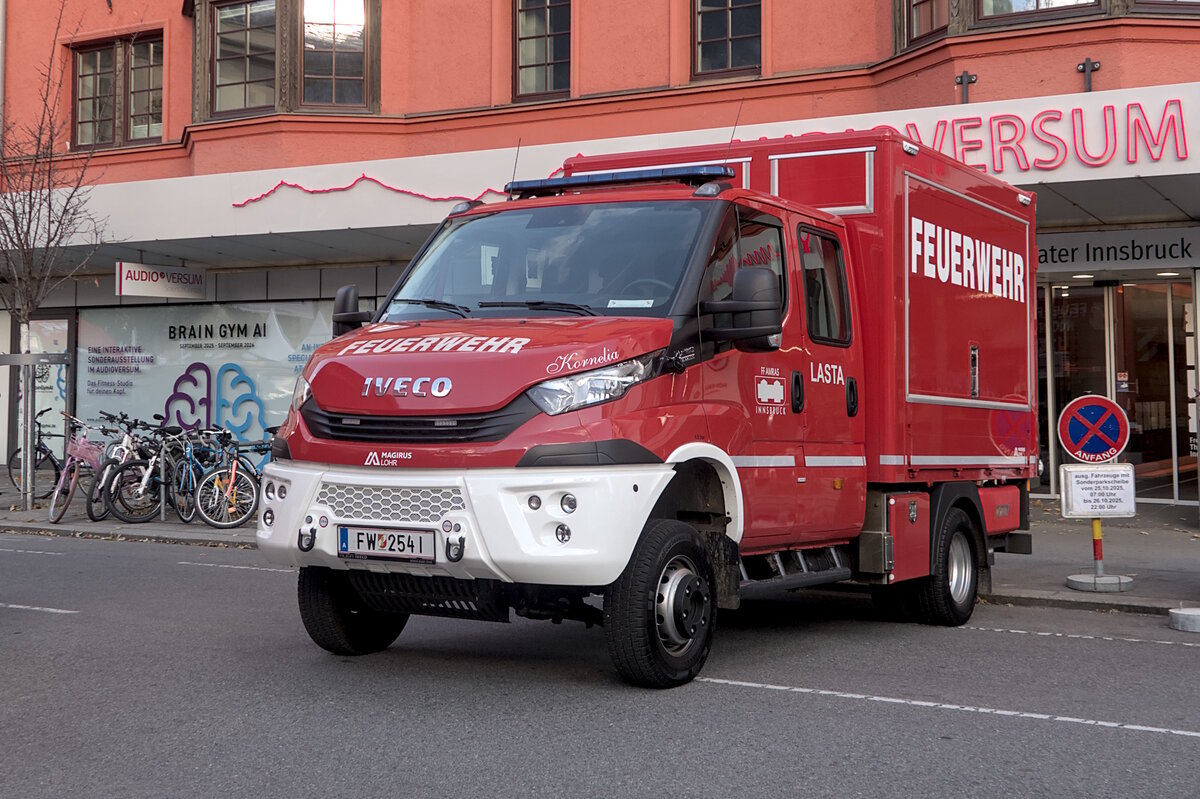 Iveco Daily "Kornelia" 70W IDN02 mit Magirus-Lohr Aufbau der Freiwilligen Feuerwehr Amras (Innsbruck), Typ LASTA. Aufgenommen am Nationalfeiertag 26.10.2025 in Innsbruck.