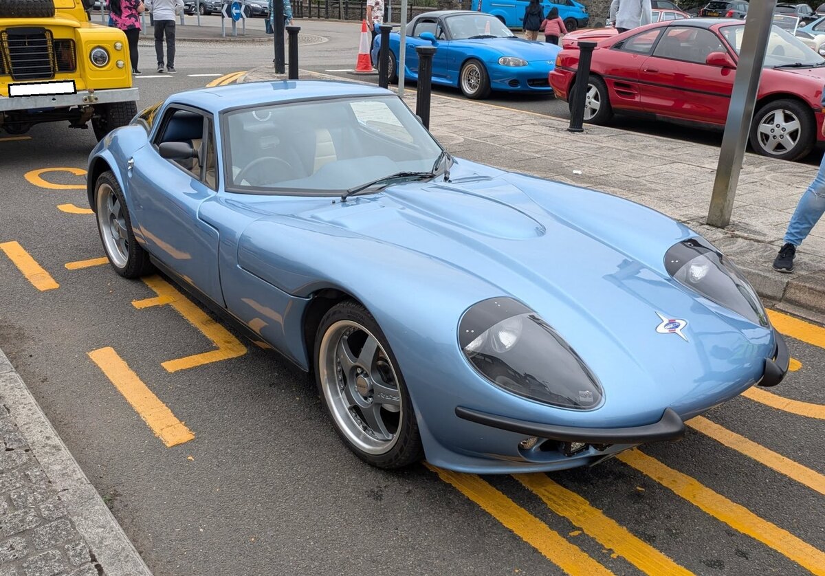 Marcos 3000GT, gebaut ab Januar 1969. Als Marcos 1500 wurde das Sportcoupe bereits 1964 vorgestellt. Für den Vortrieb sorgten bei Marcos in der Regel V4-Motoren aus dem Regal von Ford/GB. Mit Vorstellung des 3000GT wurde der V6-Motor des Ford Zodiac verbaut. Dieser Motor hat einen Hubraum von 2994 cm³ und leistet 128 PS. Für die Modelle, die in die USA exportiert wurden, verbaute die Manufaktur aus Kenilworth/Warwickshire, aufgrund der dort herrschenden, strengeren Abgasregelungen einen V6-Motor aus dem Hause Volvo. Der Volvo-Motor hat einen Hubraum von 2978 cm³ und leistet 130 PS. Classic car meeting in Brynmawr/South Wales am 27.07.2025.