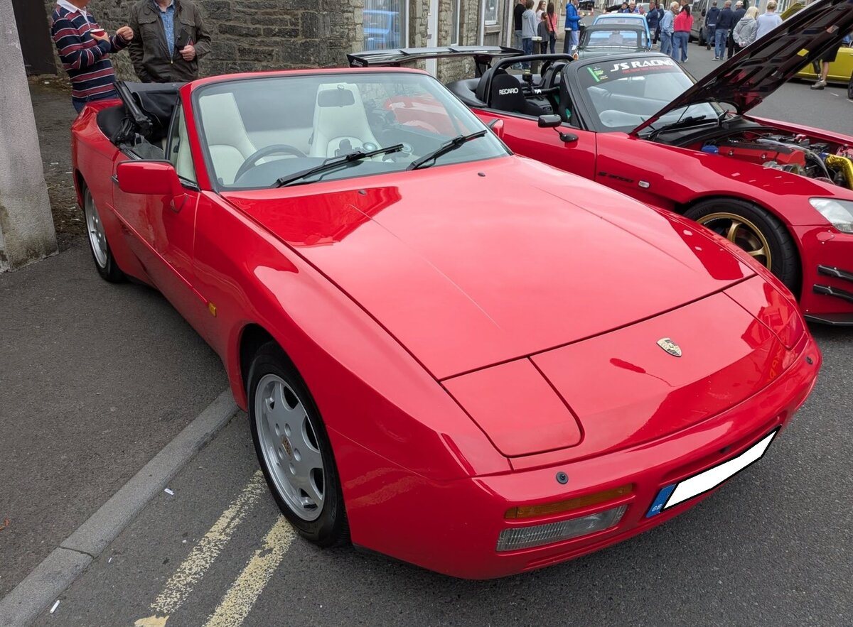 Ein rechts gelenktes Porsche 944 Coupe. Der 944´er wurde auf der IAA des Jahres 1981 vorgestellt und stand ab Januar 1982 bei den Händlern. Optisch wirkte der Porsche 944 dank der breiteren Kotflügel eindrucksvoller als der "schmalbrüstige" Porsche 924. Motorisiert war der Wagen mit einem "halbierten" V8-Motor aus dem Porsche 928. Dieser Motor hatte bis 1988 einen Hubraum von 2479 cm³ und leistete 160 PS. Nach den Werksferien 1988 erhöhte sich der Hubraum auf 2681 cm³ mit einer Leistung von 165 PS. Bei seiner Markteinführung im Januar 1982 stand ein solcher Wagen, hier im Farbton indisch rot, mit einem Kaufpreis von mindestens DM 38.900,00 in den Preislisten der Porsche AG. Classic car meeting in Brynmawr/South Wales am 27.07.2025.