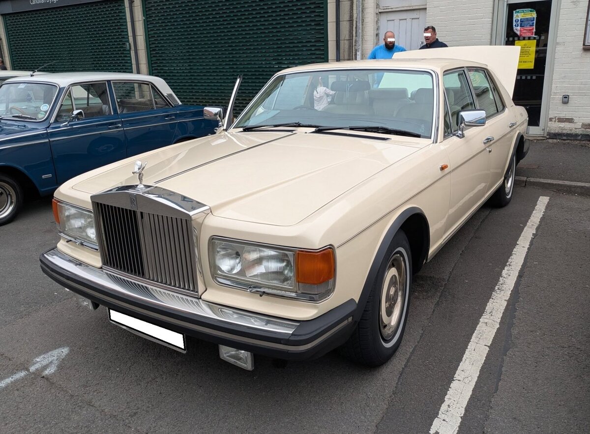 Rolls Royce Silver Spirit der ersten Serie, wie er von 1980 bis 1989 gebaut wurde. Der Silver Spirit der Series I wurde unter den Gesichtspunkten von größtmöglicher Sicherheit, von Abgasvorschriften und und Verbrauchsnormen, insbesondere in den USA und Japan, entwickelt. Motorisiert ist dieser RR mit einem V8-Motor, der aus einem Hubraum von 6750 cm³ 241 PS mobilisiert. Der gezeigte Silver Spirit wurde erstmalig im September 1981 zugelassen und ist im Farbton ivory lackiert. Classic car meeting in Brynmawr/South Wales am 27.07.2025.
