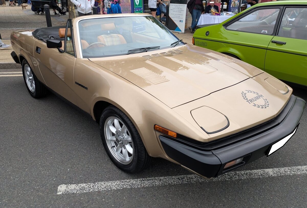 Triumph TR7 Convertible, gebaut von 1978 bis 1980. Als keilförmiges Coupe wurde der TR7 auf der Detroit Motor Show des Jahres 1975 vorgestellt. Die Convertible genannte, Cabrioletversion des TR 7 folgte drei Jahre nach der Coupe Version. Der Vierzylinderreihenmotor hat einen Hubraum von 1998 cm³ und leistet 105 PS. Der abgelichtete TR7 aus dem letzten Modelljahr 1980 ist im Farbton midas gold lackiert. Classic car meeting in Brynmawr/South Wales am 27.07.2025.