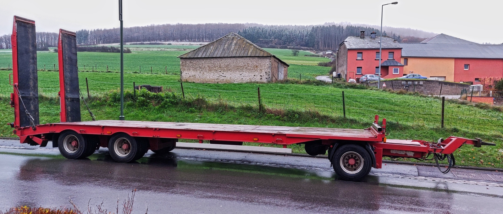 Der Baumaschinentransport Anhänger wurde am Straßenrand stehen gelassen, um die Ladung auf dem LKW zur Baustelle zu bringen. 11.2025