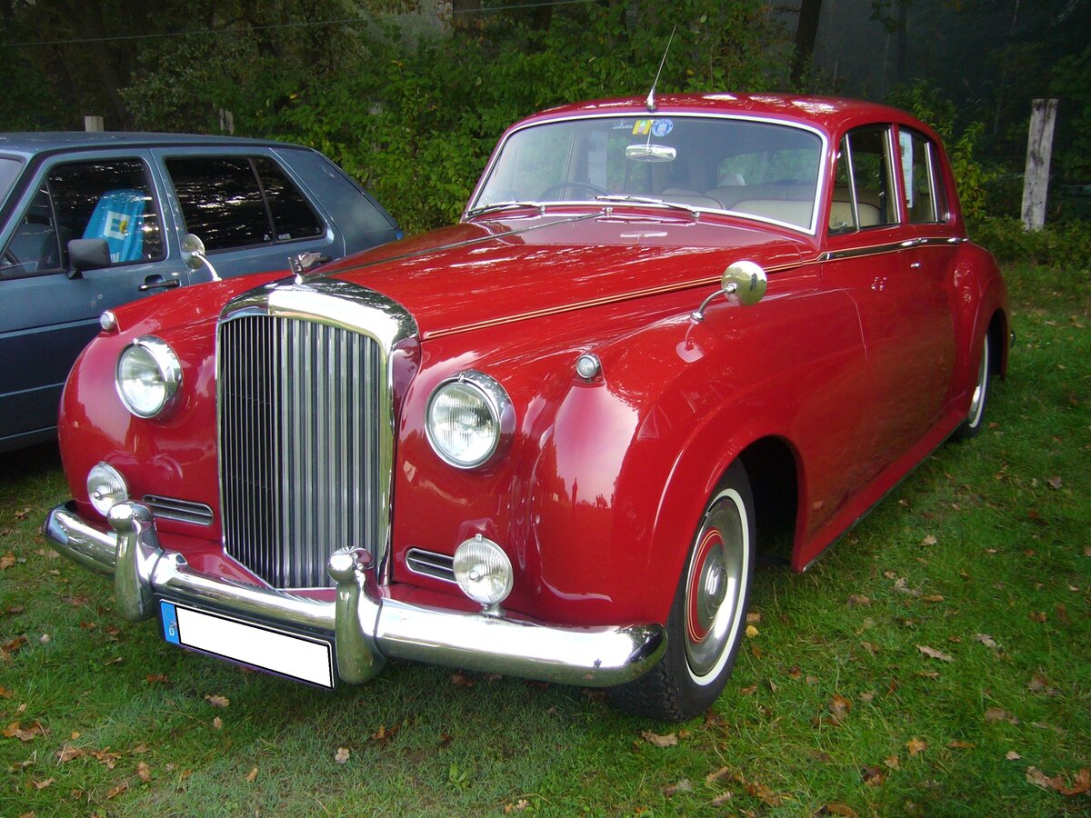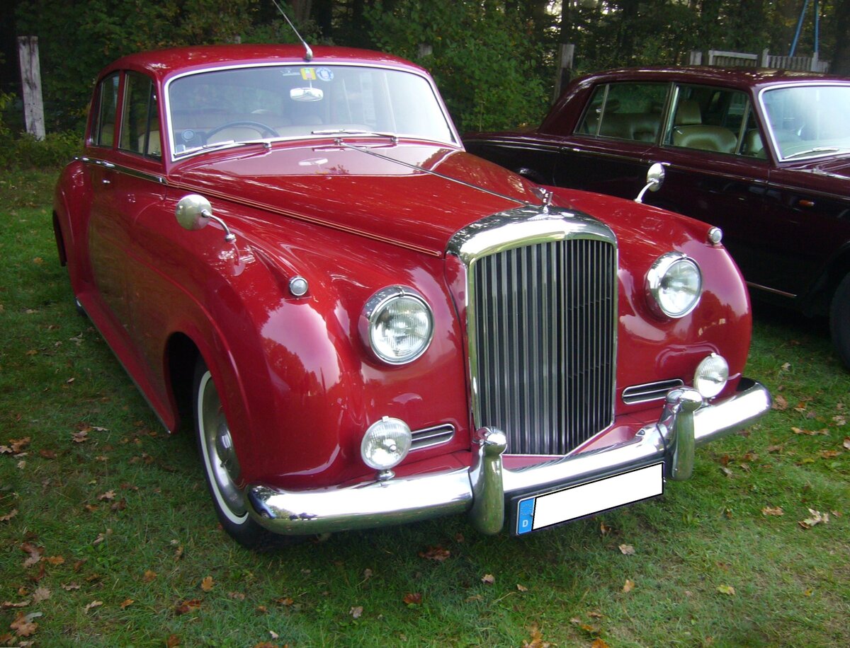 Bentley S1 Saloon im Farbton burgundy red aus dem Jahr 1958. Gebaut wurde das Modell von 1955 bis 1959. Bei eingehender Betrachtung des Bentley S1 bleiben keine Zweifel, dass die Mutterfirma Rolls-Royce die Entscheidung getroffen hatte, die Unterschiede zwischen dem Rolls-Royce Silver Cloud I und dem Bentley S1 allein auf die Kühlerform und die Markenembleme zu beschränken. Bei beiden Typen tat der Sechszylinder-Reihenmotor, für den die im Zylinderkopf angeordneten Einlassventile und die im Block stehenden Auslassventile charakteristisch waren, mit einem Hubraum von 4.887 ccm Hubraum und einer Leistung von 135 PS Dienst. Laut dem Expose am Fahrzeug war der Vorbesitzer der Politiker der englischen, konservativen Partei, Baron Michael Dobbs of Wylye (*1948). Oldtimertreffen auf dem Gelände des Bikertreffs Mutter Vogel in Marl am 28.09.2025.