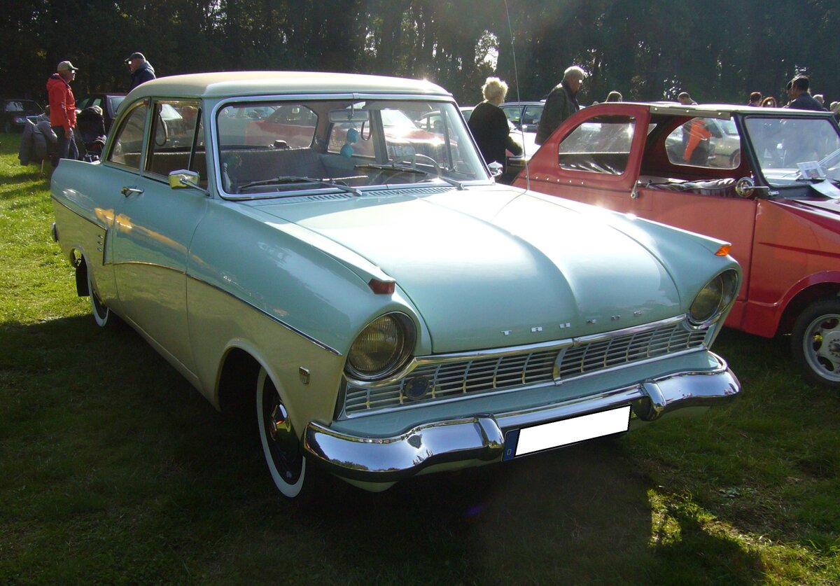 Ford Taunus P2 Limousine, gebaut in den Jahren von 1957 bis 1960. Die stark vom amerikanischen Zeitgeschmack inspirierte Karosserie, war als zwei- und viertürige Limousine, sowie als dreitüriges Kombi namens "Turnier" lieferbar. Aufgrund seiner "amerikanischen" Karosserie erhielt er in Deutschland schnell den Spitznamen "Barock-Taunus". Für eine solche, hier abgelichtete zweitürige Limousine, war mindestens ein Kaufpreis von DM 6.830,00 fällig. Als einzige Motorisierung war ein Vierzylinderreihenmotor mit 60 PS aus einem Hubraum von 1698 cm³ lieferbar. Oldtimertreffen auf dem Gelände des Bikertreffs Mutter Vogel in Marl am 28.09.2025.