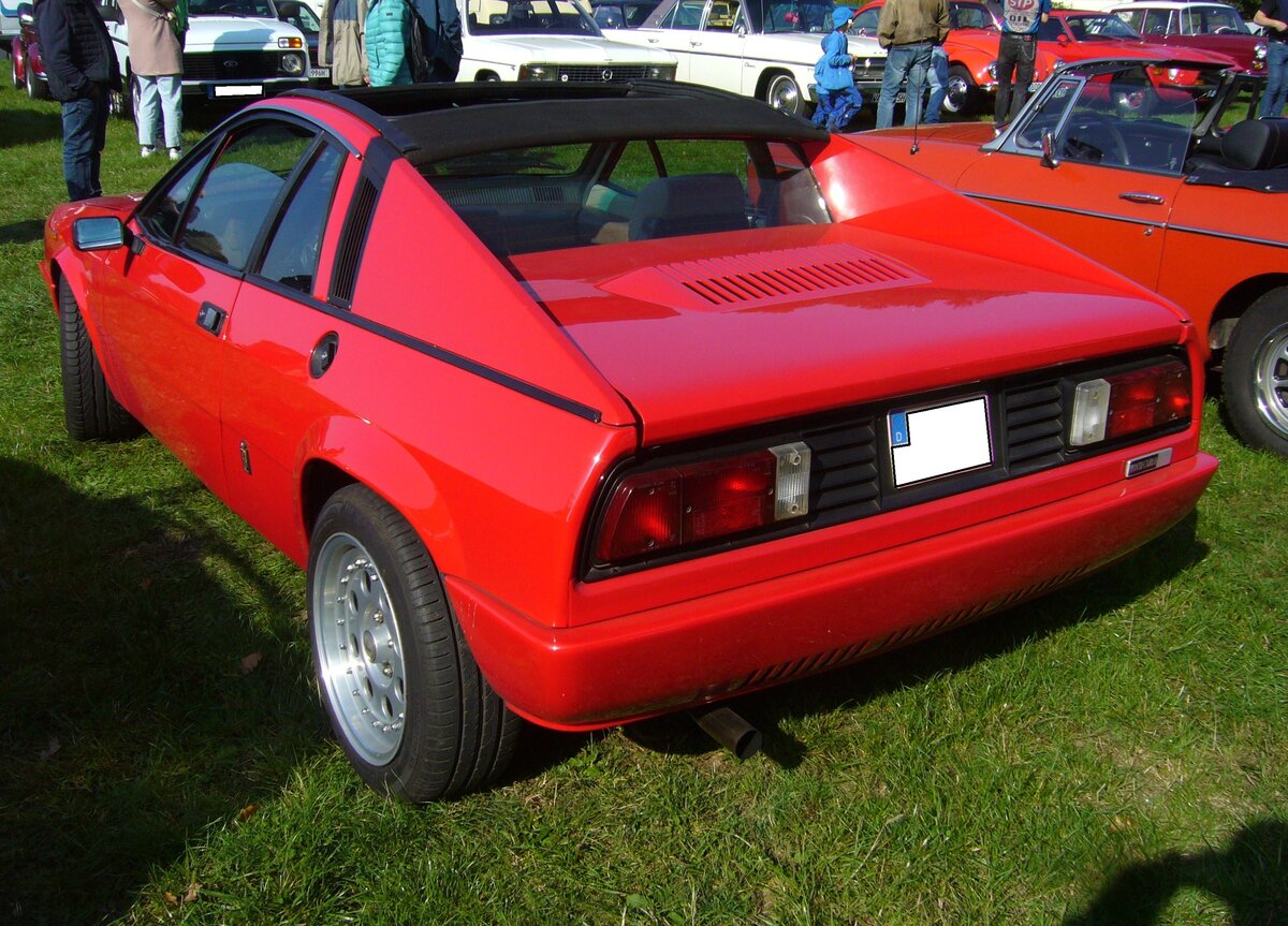 Heckansicht eines Lancia Beta Montecarlo im Farbton rosso capanelle. Oldtimertreffen auf dem Gelände des Bikertreffs Mutter Vogel in Marl am 28.09.2025.