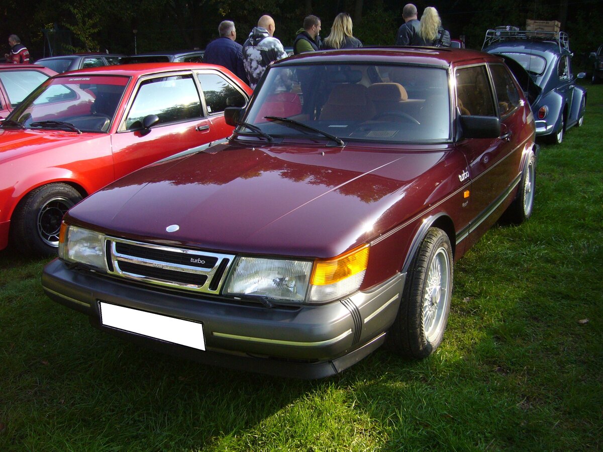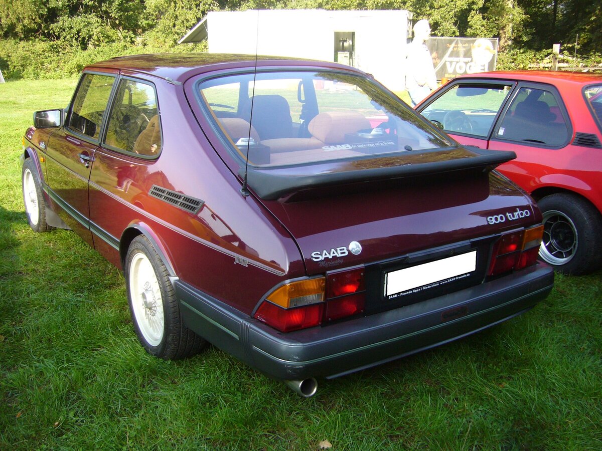 Saab 900 Turbo. Im Jahr 1978 brachte die leider nicht mehr existierende Marke aus dem schwedischen Trollhättan die Baureihe 900 auf den Markt. Das Modell wurde in zwei Baureihen etwas über 20 Jahre produziert. Die hier gezeigte zweitürige Fließhecklimousine stammt aus der ersten Baureihe, die bis 1993 gebaut wurde. Der turboaufgeladene Vierzylinderreihenmotor hat einen Hubraum von 1985 cm³ und leistet 145 PS. Die Spitzengeschwindigkeit gaben die Schweden mit 195 km/h an. Oldtimertreffen auf dem Gelände des Bikertreffs Mutter Vogel in Marl am 28.09.2025.