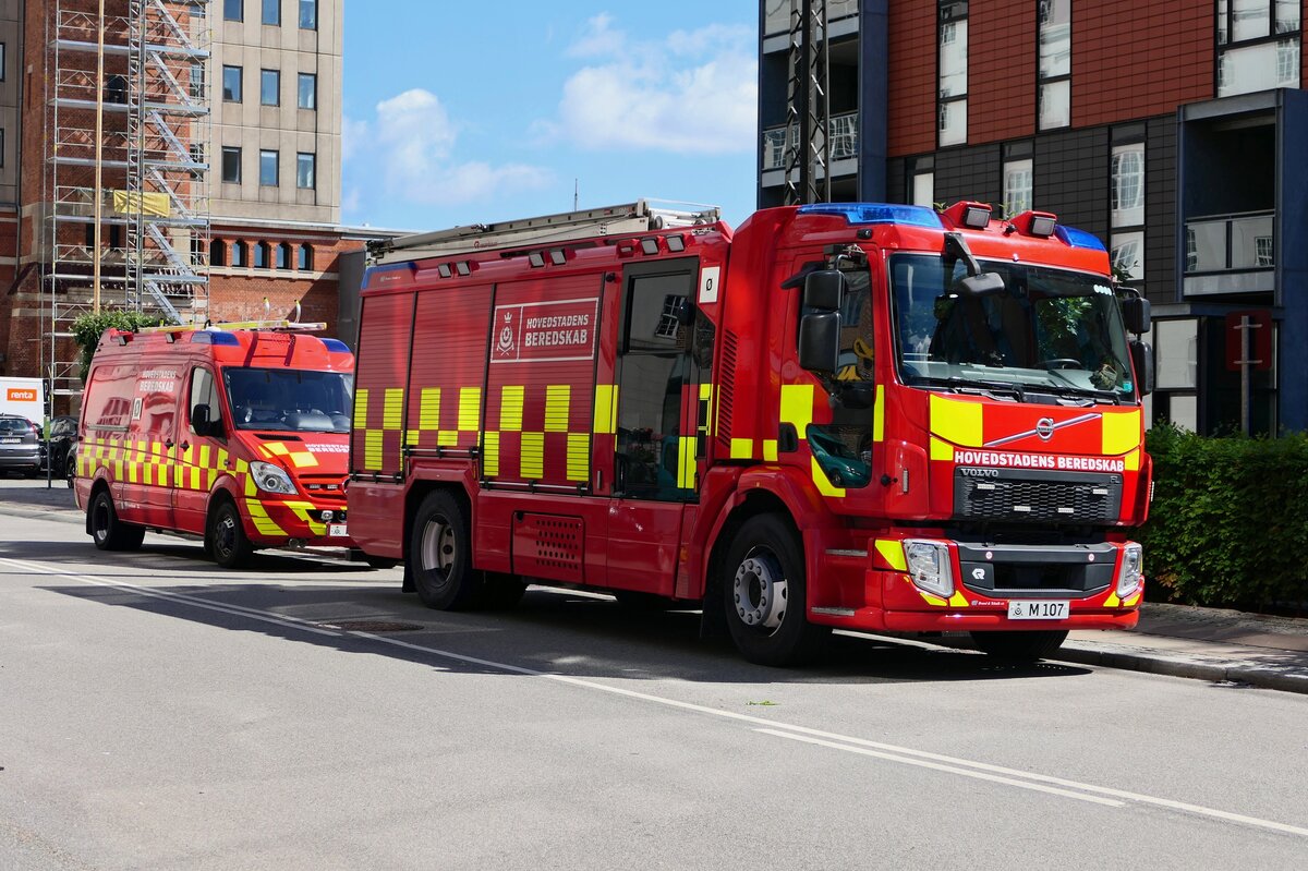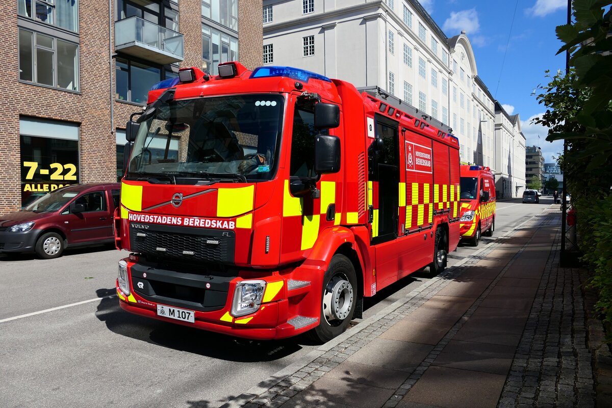 Hovestadens Beredskab mit Volvo FL280 und MB Sprinter CDI 519 Einsatzfahrzeug. Kopenhagen-Østerbro im Mai 2025.
