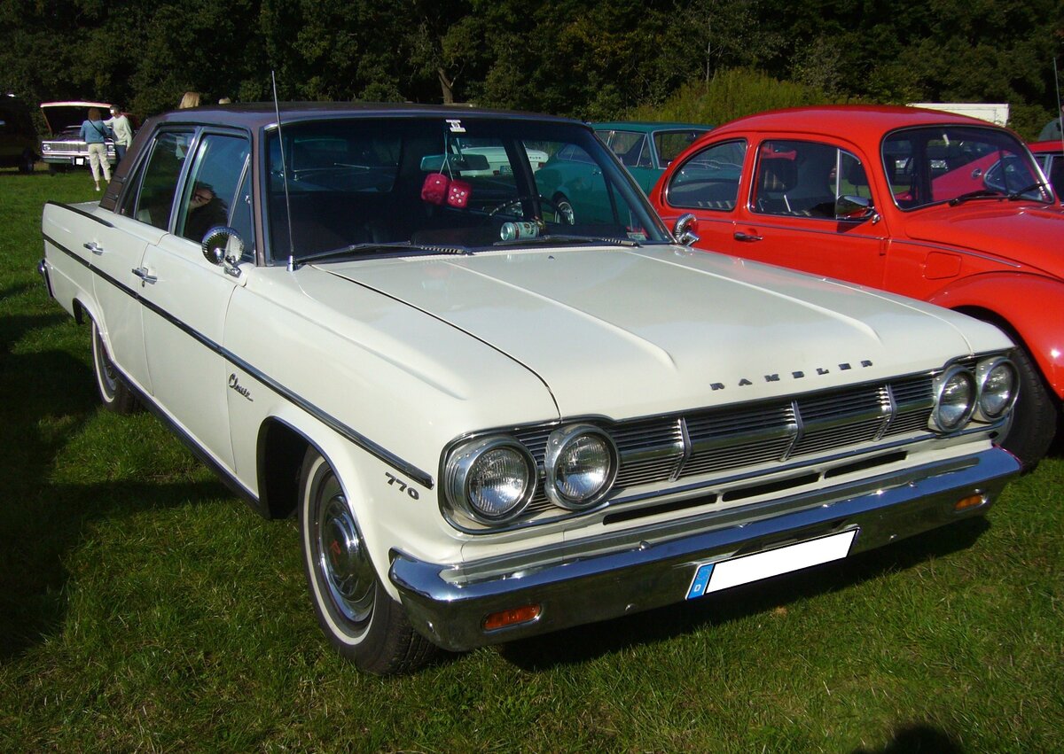 Rambler 770 Classic fourdoor Sedan im Farbton frost white aus dem Jahr 1965. Die Marke Rambler war eine Division der AMC (A merican M otors C orporation) und stellte bis 1969 Automobile her. Bekannteste Modelle waren wohl die Baureihen "American", "Ambassador" und eben der hier gezeigte "Classic". Die Clasic-Baureihe war ab 1963 im Programm der Marke aus Kenosha im Bundesstaat Wisconsin. Das Modell war, wie in den USA üblich, in etlichen Karosserieversionen lieferbar. Der hier gezeigte 770 Classic war das Toppmodell dieses Modelljahrganges. Bei der Motorisierung hatte der Kunde drei Optionen. Zwei Sechszylinderreihenmotoren mit Hubräumen von 199 cui (3261 cm³) mit 128 PS oder 145 PS, sowie 232 cui (3801 cm³) mit 155 PS. Außerdem war ein V8-Motor mit einem Hubraum von 287 cui (4703 cm³) und einer Leistung von 198 PS lieferbar. Oldtimertreffen auf dem Gelände des Bikertreffs Mutter Vogel in Marl am 28.09.2025.
