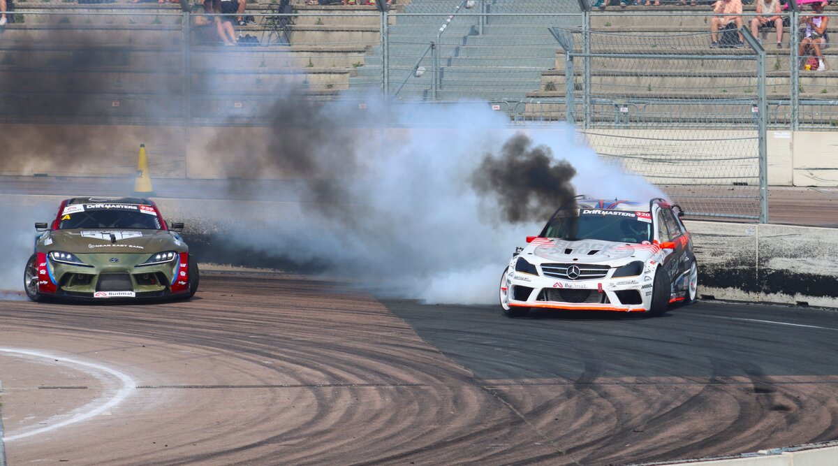 Toyota Supra und Mercedes Benz C-Klasse beim Driftmasters Grand Prix in Ferropolis (Gräfenhainichen) am 14.08.25 auf der Rennstrecke
