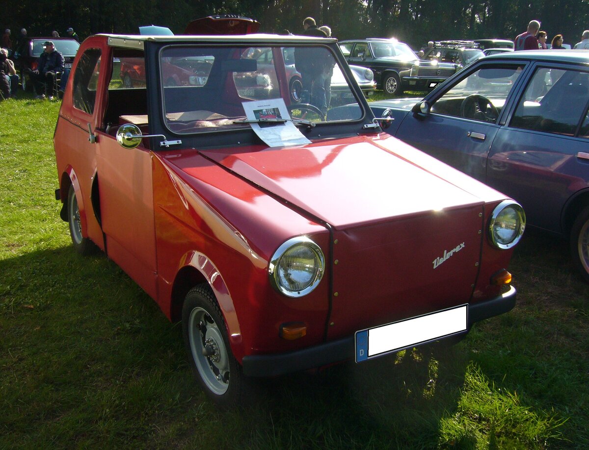Velorex 435 O. In den Jahren von 1971 bis 1973 baute die Marke Velorex in der heutigen Tschechischen Republik 1380 dieser, als Invalidenfahrzeuge konzipierten, Kleinwagen. Es sollte das damals recht verbreitete Dreiradfahrzeug Oskar 16 bzw. Velorex 16 ablösen. Den Antrieb dieses Zweisitzigen Fahrzeuges mit Rolldach besorgt der Einzylinderzweitaktmotor aus dem tschechischen Motorrad Jawa 354. Dieser Motor benötigt Kraftstoff im Mischungsverhältnis 1:25 und hat einen Hubraum von 344 cm³ mit einer Leistung von 17 PS. Das Fahrzeug soll eine Höchstgeschwindigkeit von rund 85 km/h erreichen. Oldtimertreffen auf dem Gelände des Bikertreffs Mutter Vogel in Marl am 28.09.2025.
