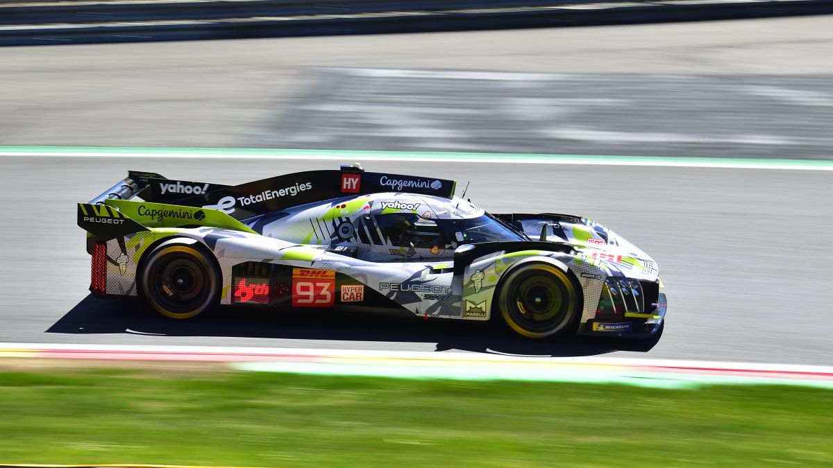 #93 Peugeot 9X8 (2024), Werksteam Peugeot TotalEnergies, Fahrer: Mikkel Jensen, Paul di Resta & Jean-Éric Vergne, am 10. Mai 2025, auf dem Circuit de Spa-Francorchamps, dritte Wertungslauf der FIA-Langstrecken-Weltmeisterschaft 2025 statt.