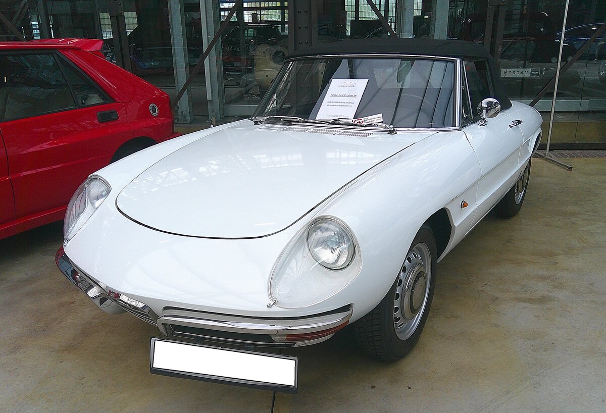 Alfa Romeo Duetto Spider, gebaut in den Jahren 1966 -bis 1969. Werksintern hieß die Baureihe 105/115. Anfangs war der Wagen nur mit einem 1.6l Vierzylinderreihenmotor ausgerüstet. Ab 1967 wurde die Motorenpalette mit dem 1750 Veloce nach oben und mit dem 1300´er nach unten abgerundet. Der abgelichtete "Duetto" im Farbton bianco classico ist ein früher 1600´er. Der Motor leistet 109 PS aus einem Hubraum von 1570 cm³. Der gezeigte Duetto Spider stammt aus dem ersten Modelljahr 1966. Classic Remise Düsseldorf am 03.10.2025.