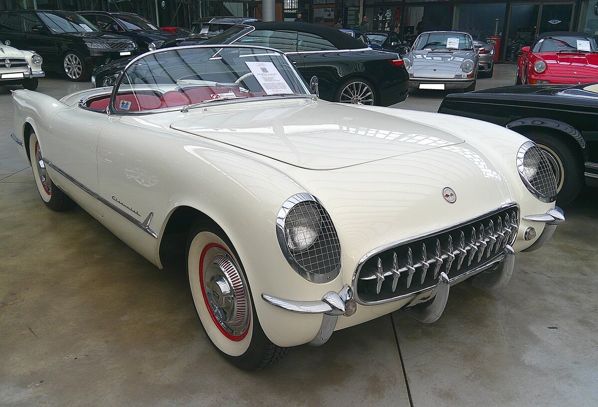 Chevrolet Corvette aus dem Jahr 1954 im Farbton polo white. Die Jahrgänge 1953 und 1954 waren bei der Corvette C1 identisch. 1953 war für die solche Corvette ein Kaufpreis von mindestens US$ 3.512,00 zu zahlen. Im Modelljahr1954 erhöhte sich der Basispreis um satte US$ 11,00. Im Jahr 1953 verkaufte sich die Corvette lediglich 315 mal. Ein Jahr später bereits 3.640 mal. Der V8-Motor dieses Autos hat einen Hubraum von 235.5 cui (3859 cm³) und leistet 156 PS. Die gezeigte Corvette ist die neunundsechszigste je gebaute Corvette, aus dem damals neu errichteten Werk St. Louis. Classic Remise Düsseldorf am 03.10.2025.