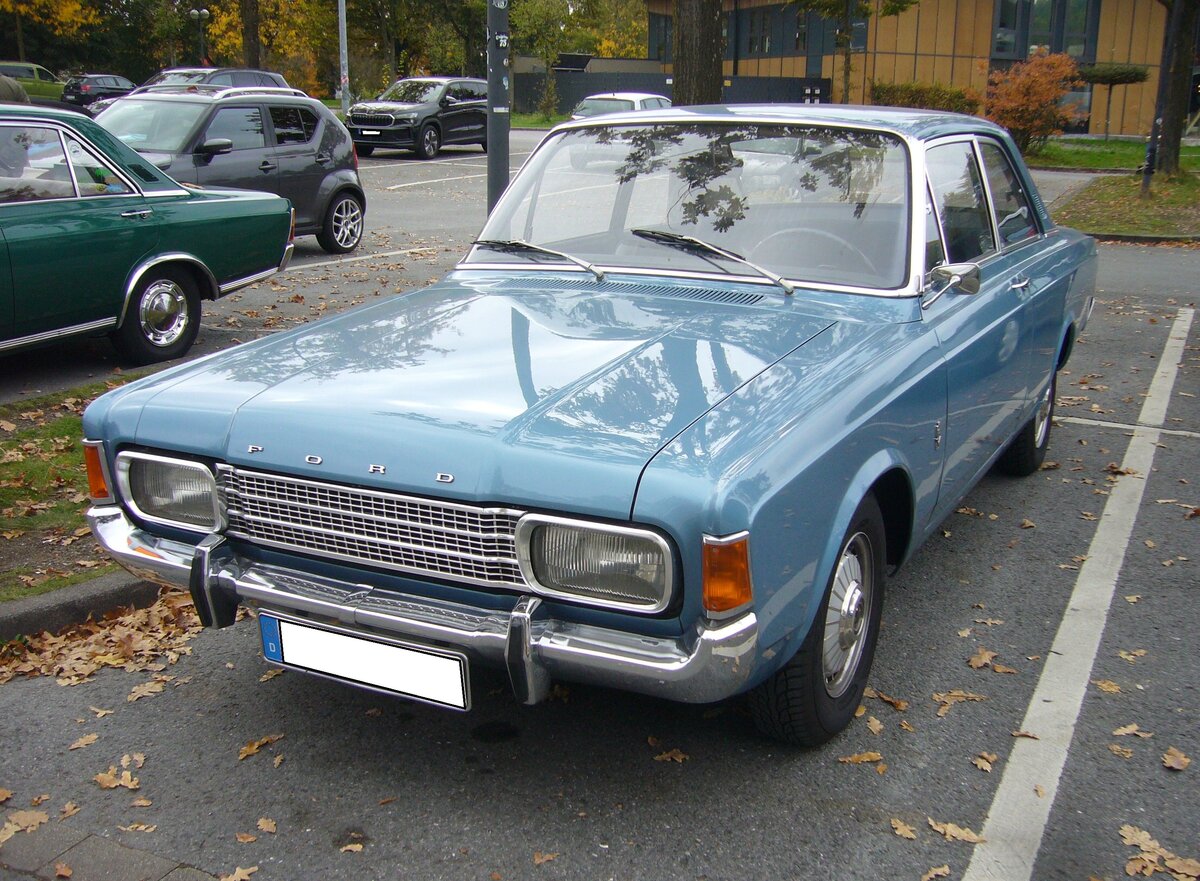 Ford Taunus P7b 1800S in der Karosserieversion zweitürige Limousine. In dieser Variante stand das Modell von 1968 bis 1971 in den Preislisten der Ford-Werke. Der selten georderte 1800S V6-Motor hat einen Hubraum von 1812 cm³ Hubraum und eine Leistung von 82 PS. Der gezeigte P7b trägt allerdings die Radkappen des damaligen Spitzenmodells 26M. Oldtimertreffen am Cafe del Sol in Gelsenkirchen am 12.10.2025.