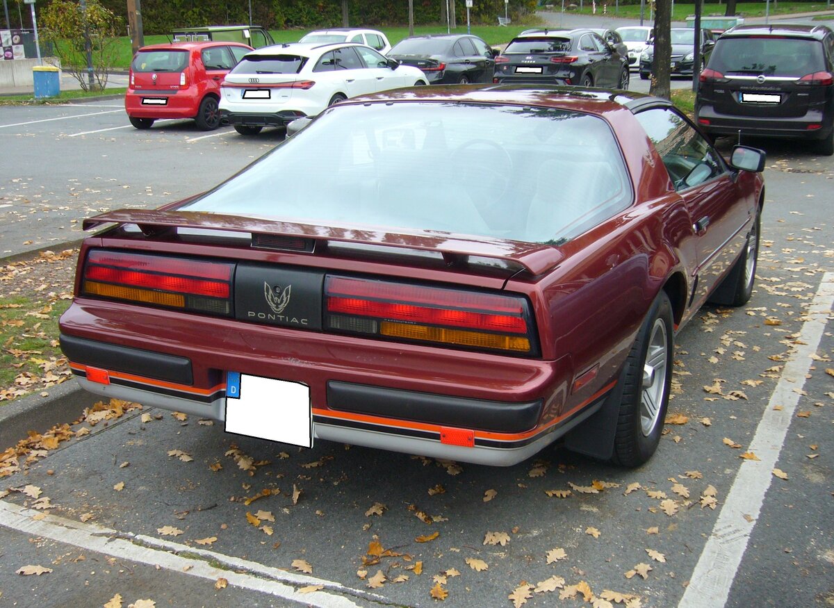 Heckansicht eines Pontiac Firebird Trans Am im Farbton blaze red aus dem Jahr 1985. Oldtimertreffen am Cafe del Sol in Gelsenkirchen am 12.10.2025.