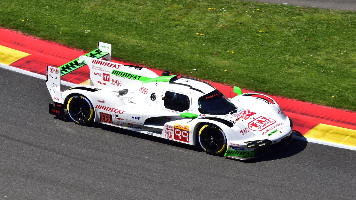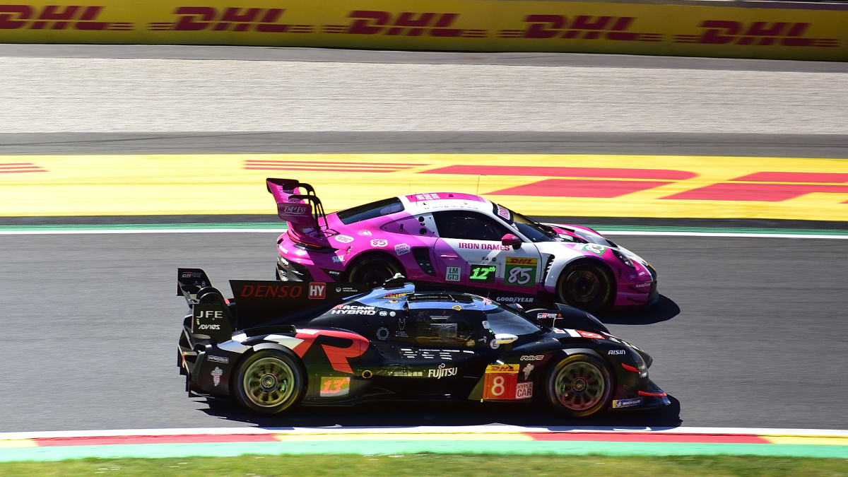Keine Chance bei zu halten für den Porsche 911 GTLM3 mit der #85 gegen den Prototypen #8 vom Werksteam Toyota Gazoo Racing eingesetzter Toyota GR010 Hybrid, am 10. Mai 2025, auf dem Circuit de Spa-Francorchamps, dritte Wertungslauf der FIA-Langstrecken-Weltmeisterschaft 2025 statt