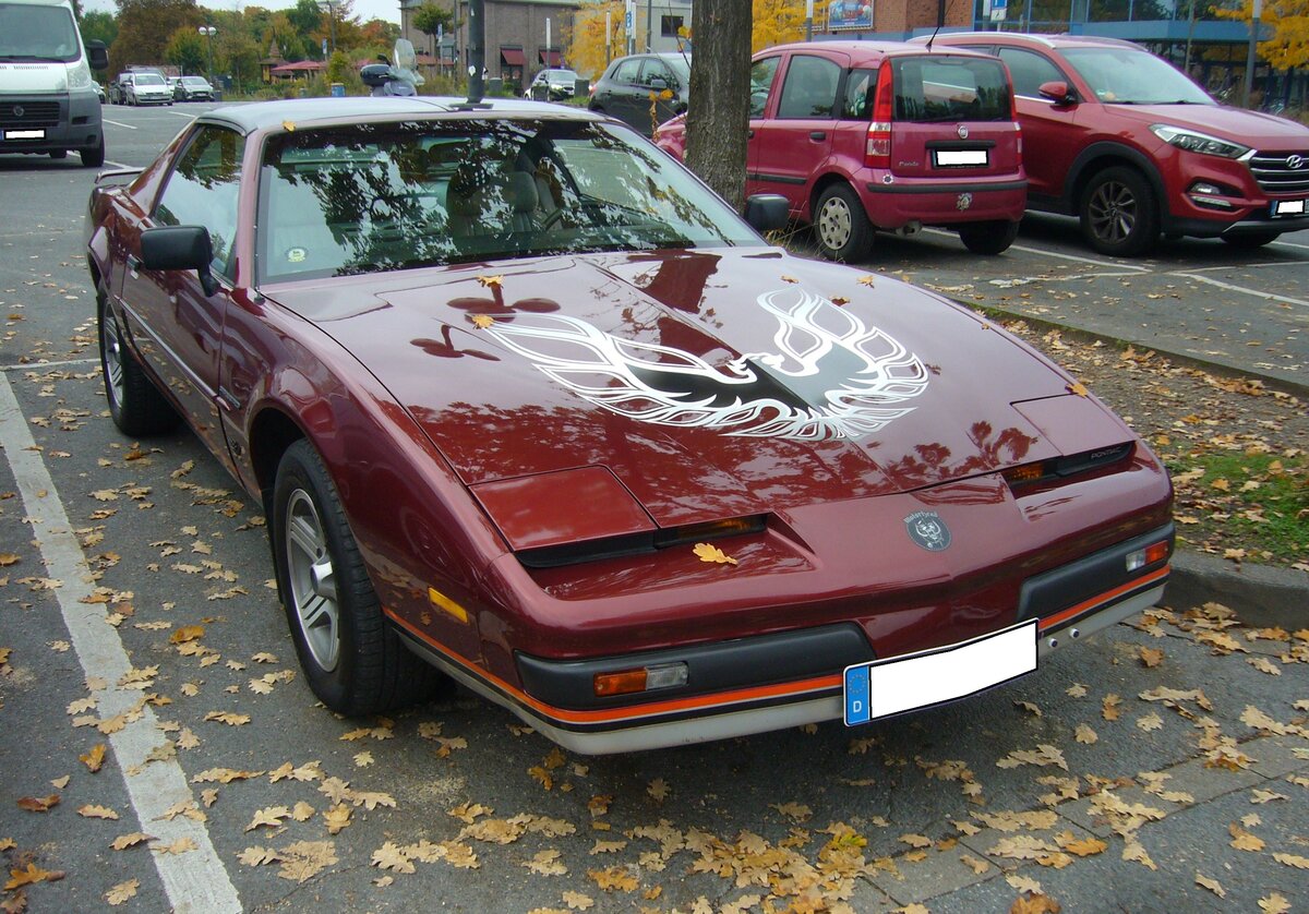 Pontiac Firebird Trans Am im Farbton blaze red aus dem Jahr 1985. Die Baureihe Firebird kam 1967 auf den Markt, als General Motors mit dem Chevrolet Camaro ein Konkurrenzmodell zum erfolgreichen Ford Mustang in die Modellpalette aufnahm. Der Firebird basierte auf der Plattform des Camaro. Im Modelljahr 1985 setzte die GM-Tochter Pontiac 11.113 Autos dieses Typs ab. Der V8-Motor hat einen Hubraum von 5013 cm³ und leistet 193 PS. Oldtimertreffen am Cafe del Sol in Gelsenkirchen am 12.10.2025.