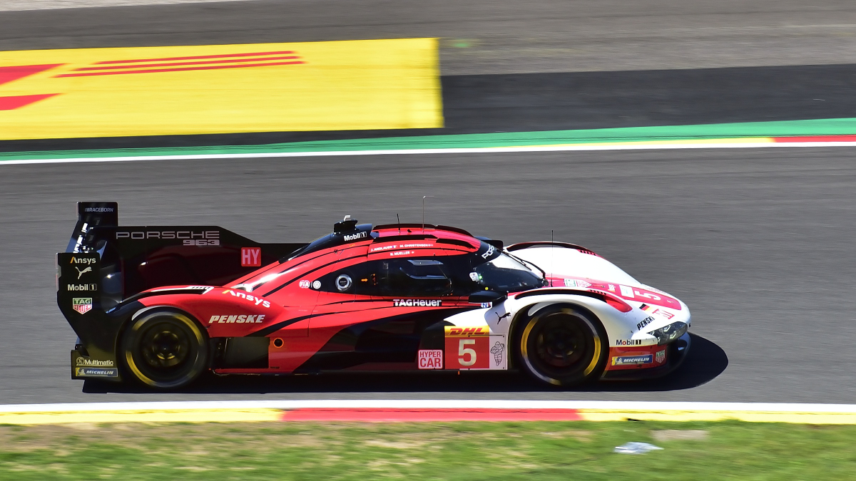 Vom Werksteam Porsche Penske Motorsport eingesetzter Porsche 963 #5, Fahrer: Julien Andlauer, Michael Christensen & Nico Müller, am 10. Mai 2025, auf dem Circuit de Spa-Francorchamps, dritte Wertungslauf der FIA-Langstrecken-Weltmeisterschaft 2025 statt.