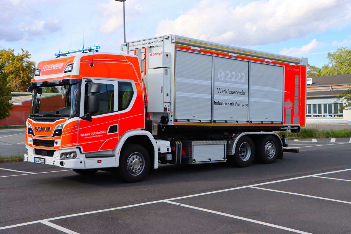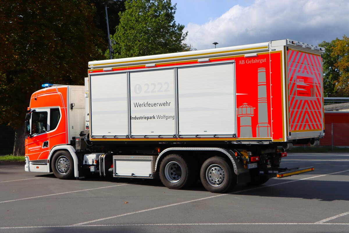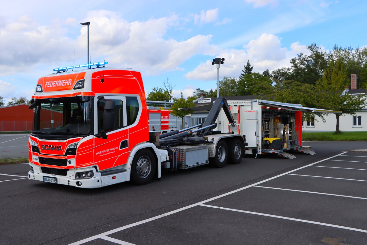Werkfeuerwehr Industriepark Hanau Wolfgang Scania L360 WLF mit AB-Gefahrgut von GSF (Florian IPW 01-55-1) am 14.09.25 bei einen Fototermin. Danke für das tolle Shooting