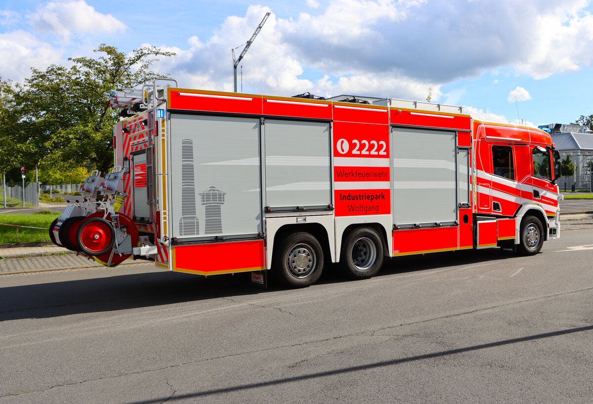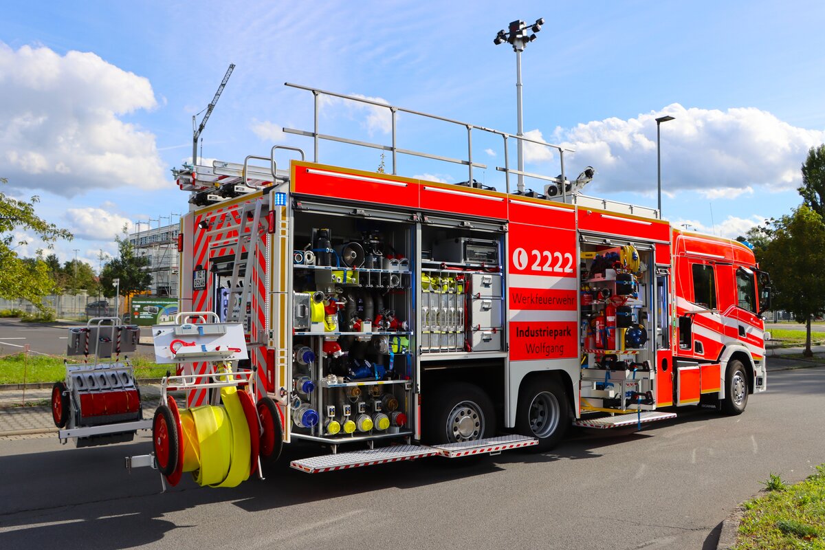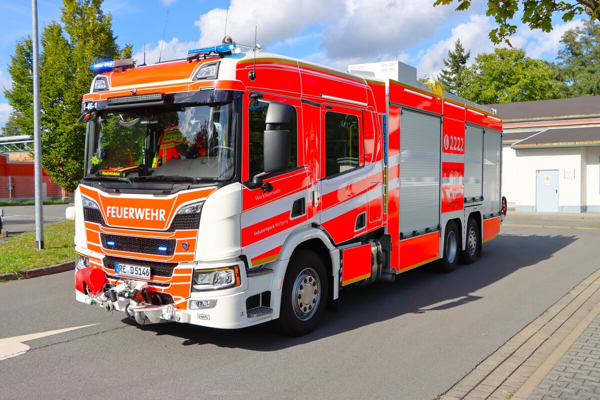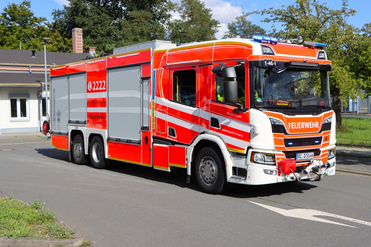 Werkfeuerwehr Industriepark Hanau Wolfgang Scania P500 EMPL HLF (Florian IPW 01-46-1) am 14.09.25 bei einen Fototermin. Danke für das tolle Shooting