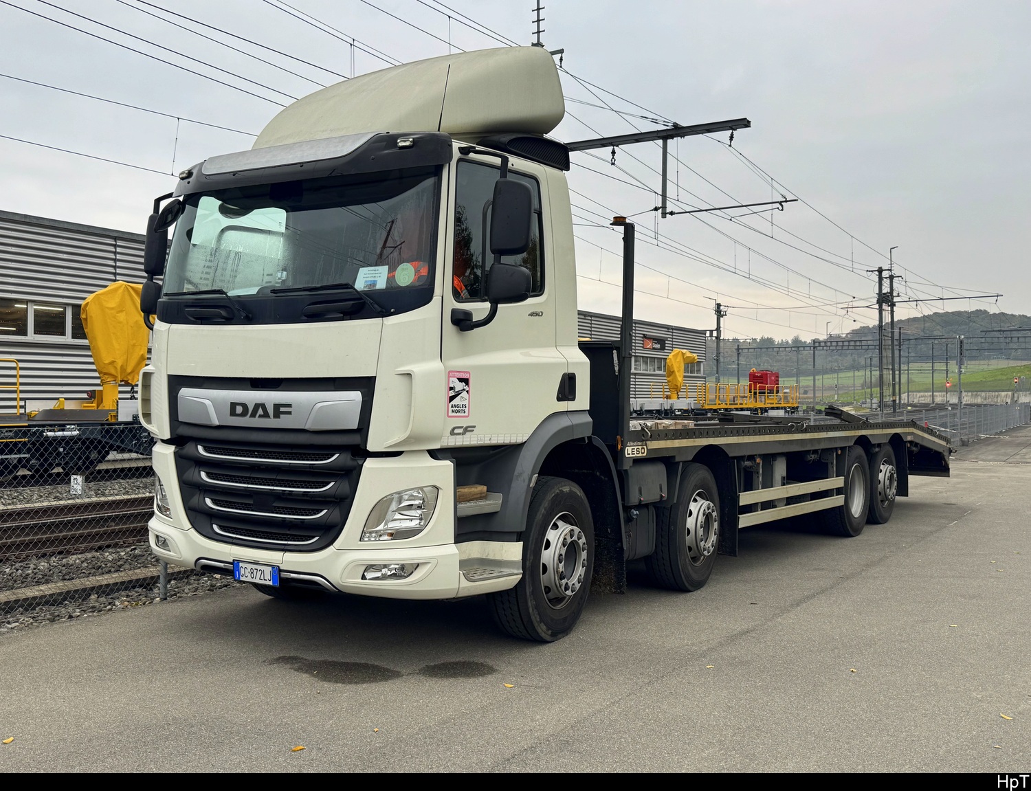 DAF CF 450 mit offener Ladefläche zum Transport von Schmalspur Bahnfahrzeuge abgestellt in Siselen am 17.10.2025