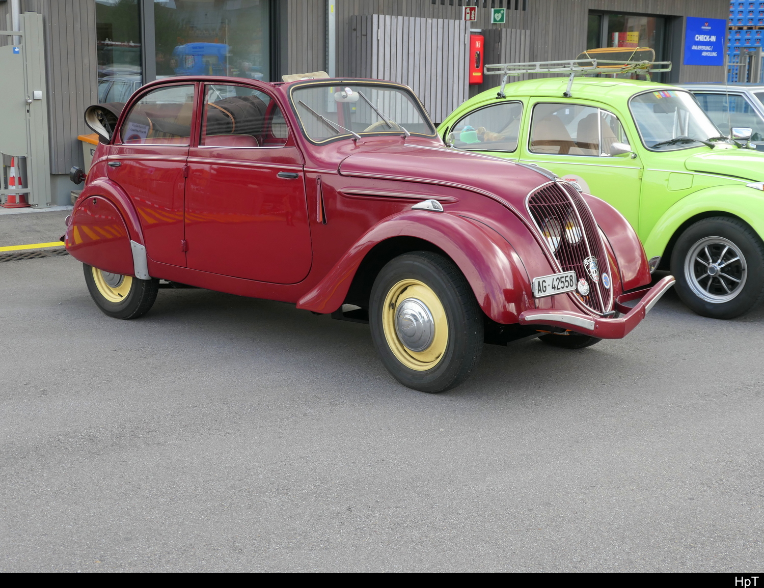 Roter Peugeot 202 AG 42558 im Areal der Feldschlösschen Brauerei ausgestellt und Zugänglich für alle am Oldtimertreffen in Rheinfelden am 27.09.2025