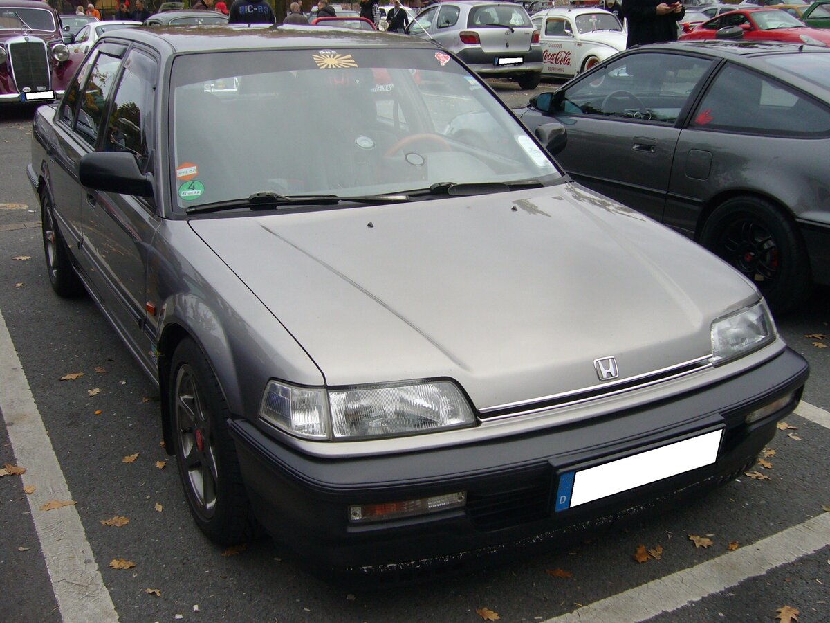 Honda Civic MK4 Stufenhecklimousine im Farbton misty beige. Die vierte Generation des Honda Civic stand ab 1987 bei den Händlern. Das Modell war als zweitürige Steilheck-Limousine, viertürige Stufenheck-Limousine, allradangetriebenes Kombi mit Hochdach, sowie als Sport-Coupe namens CRX lieferbar. Der Kunde konnte zwischen etlichen Motorisierungen wählen. Der gezeigte Wagen ist mit dem stärksten, damals lieferbaren Motor ausgestattet. Der Vierzylinderreihenmotor hat einen Hubraum von 1590 cm³ und leistet 130 PS bzw. 124 PS PS, wenn ein Katalysator verbaut war. Eine solche viertürige Limousine kostete mindestens DM 24.290,00. Oldtimertreffen am Cafe del Sol in Gelsenkirchen am 12.10.2025.