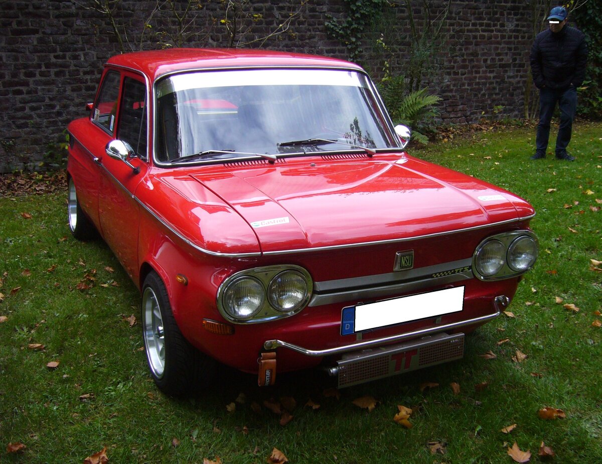 NSU TT, gebaut in Neckarsulm von 1968 bis 1972. Von diesem sportlichen Gebrauchswagen wurden insgesamt 64.269 Einheiten produziert. Davon 14.942 mit dem 1.0l Motor und 49.327 mit dem 1.2l Motor. Der abgelichtete TT im Farbton derbyrot hat serienmäßig einen, im Heck verbauten, Vierzylinderreihenmotor mit einem Hubraum von 1085 cm³ und leistet serienmäßig 55 PS. Wenn wir uns allerdings diesen TT mit Ölumlaufkühler etc. betrachten, dürfte die Motorleistung um einiges höher sein. Oldtimertreffen am Theater an der Niebu(h)rg am 19.10.2025 in Oberhausen/Rheinland.