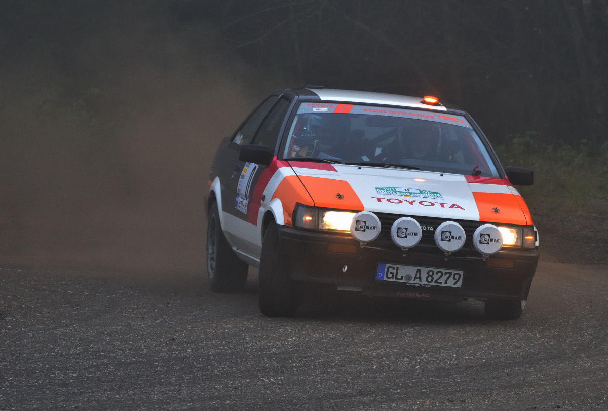Toyota Corolla 1600 GT 2 Door AE86, Joachim Wirths Vorausfahrzeug der ADAC Rallye Köln-Ahrweiler am 9.11.2024. Parkplatz Kurs Müllenbach P3 des Nürburgrings. Kurz vor Abbruch wegen Nebel.