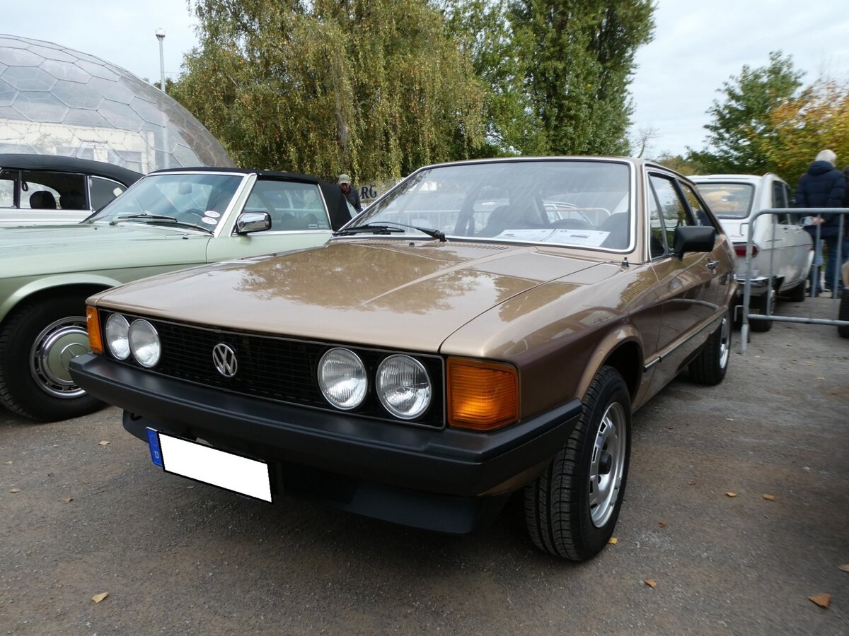 VW Scirocco 1 MK2, wie er von 1974 bis 1980 mit einigen Facelifts bei Karmann montiert wurde. Der abgelichtete Scirocco hat die recht "sportliche" GT-Ausstattung und ist im Farbton sandmetallic lackiert. Das gezeigte Modell gehört zur zweiten Serie, dieses ist an den Stoßstangen und den herum gezogenen, vorderen, Blinkern erkennbar. Ein solcher, Scirocco stand mit einem Kaufpreis von DM 15.520,00 in den Preislisten der VW-Händler. Der quer eingebaute Vierzylinderreihenmotor hat einen Hubraum von 1588 cm³ und leistet 85 PS. Die Höchstgeschwindigkeit gab Volkswagen mit 172 km/h an. Der gezeigte Scirocco verbrachte seine Autojugend in Südfrankreich. Oldtimertreffen am Theater an der Niebu(h)rg am 19.10.2025 in Oberhausen/Rheinland.