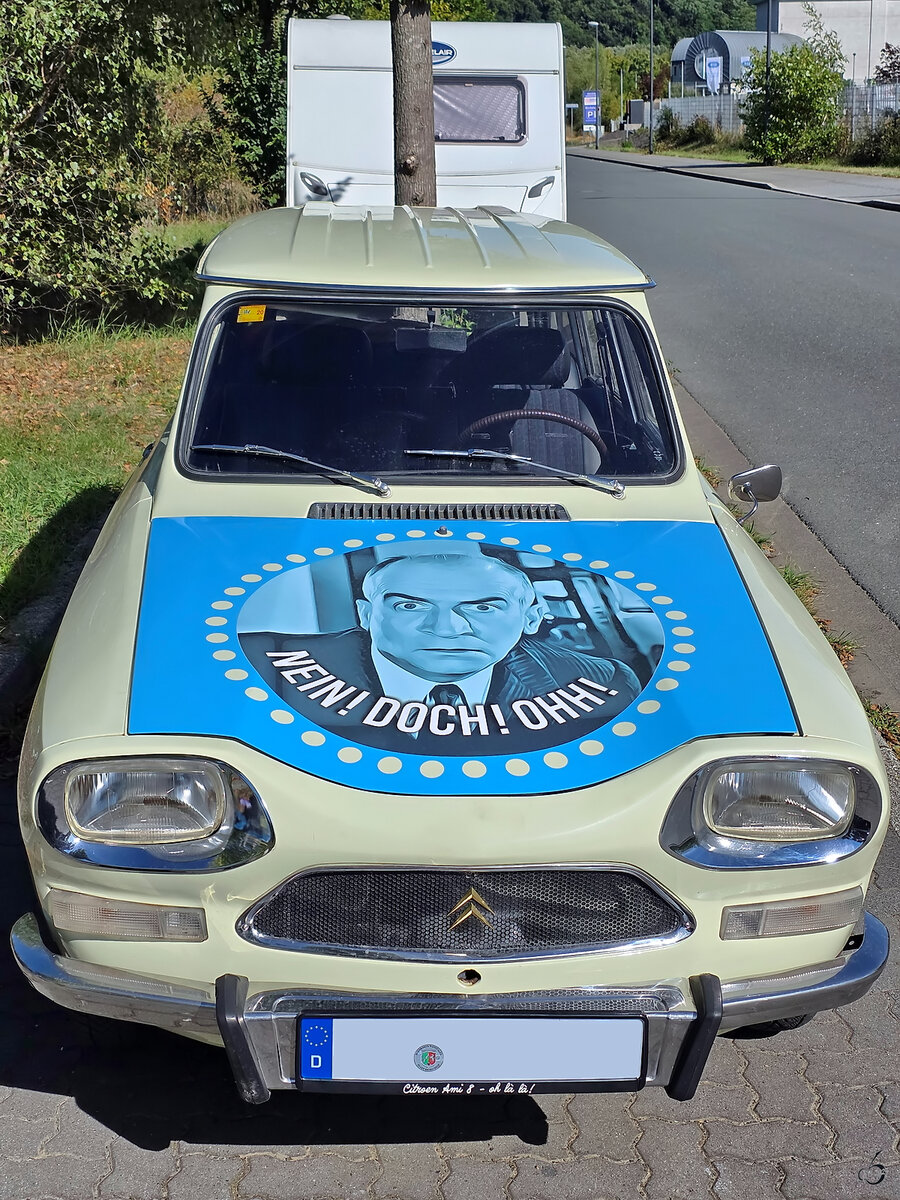 Dieser Citroën Ami 8 scheint einem Fan des französischen Schauspieles Louis de Funés zu gehören. (Hattingen, September 2025)
